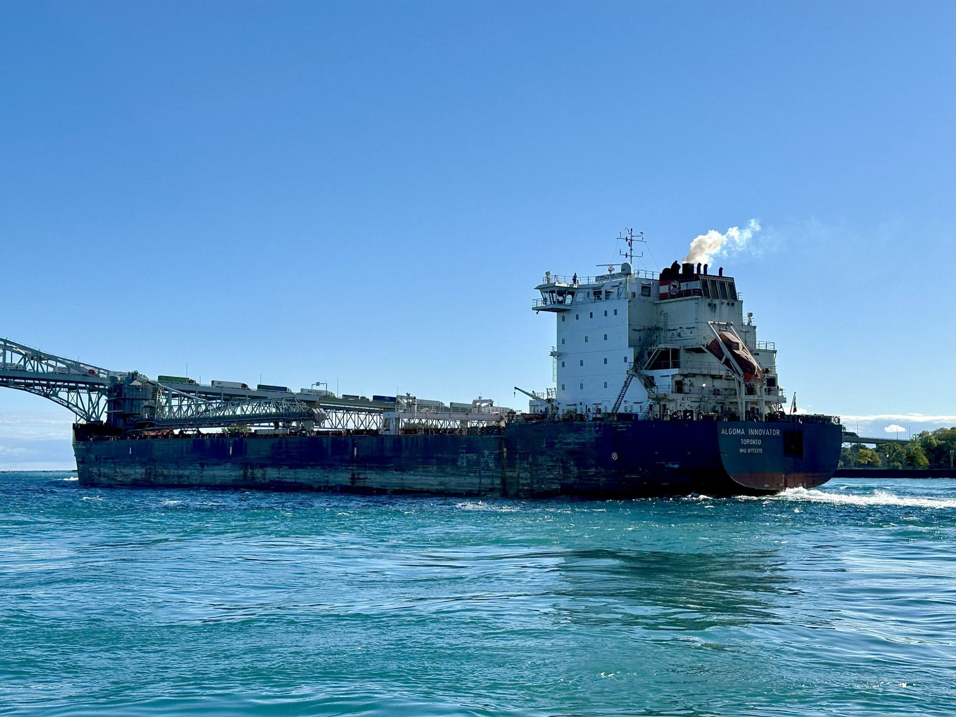 Lake freighter Algoma Innovator (Algoma Central Corporation) at the Blue Water Bridge on a sunny morning. Port Huron, Michigan, August 30, 2025.