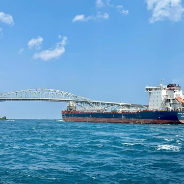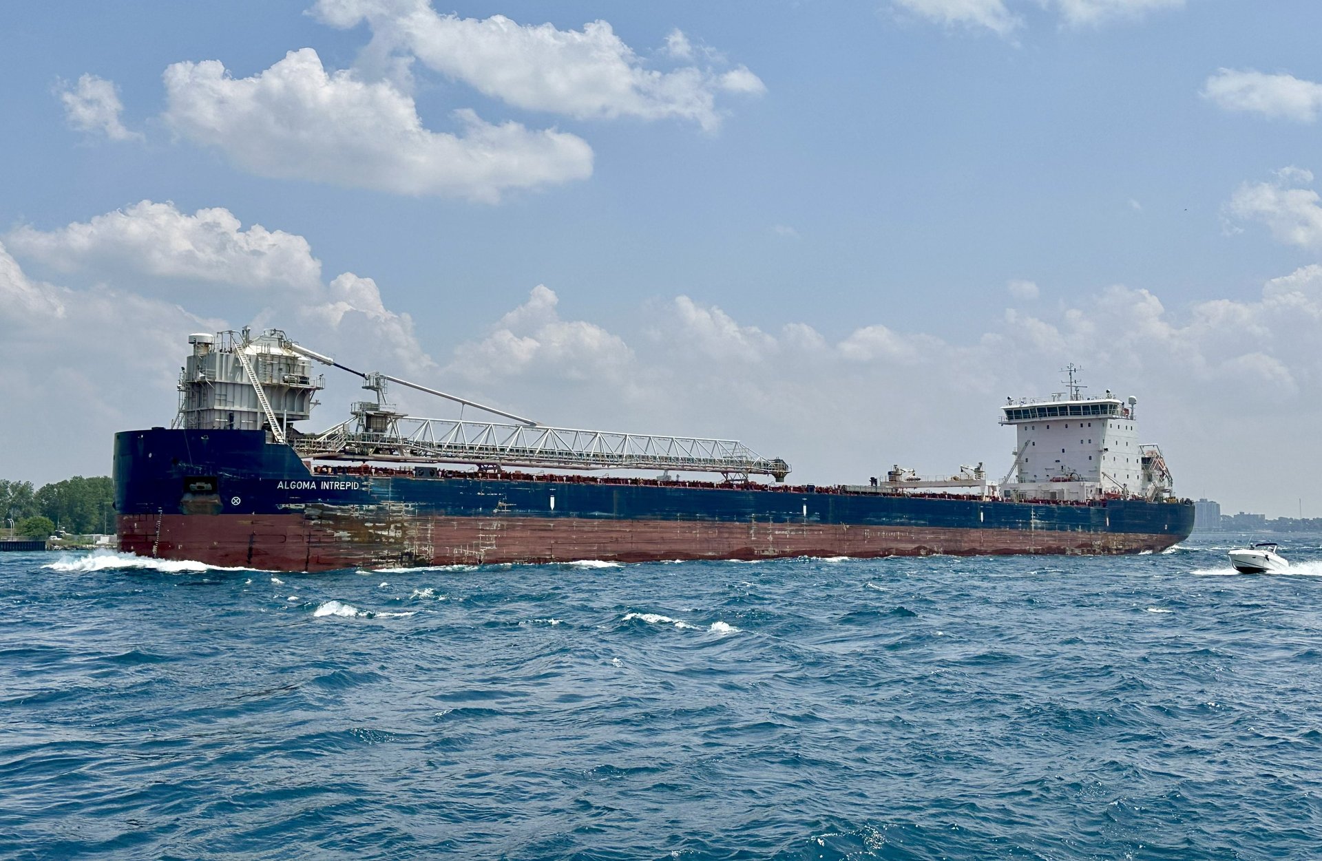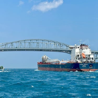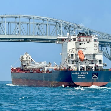Freighter Algoma Intrepid passes under the Blue Water Bridge on a choppy day on the St. Clair River. July 13, 2025.