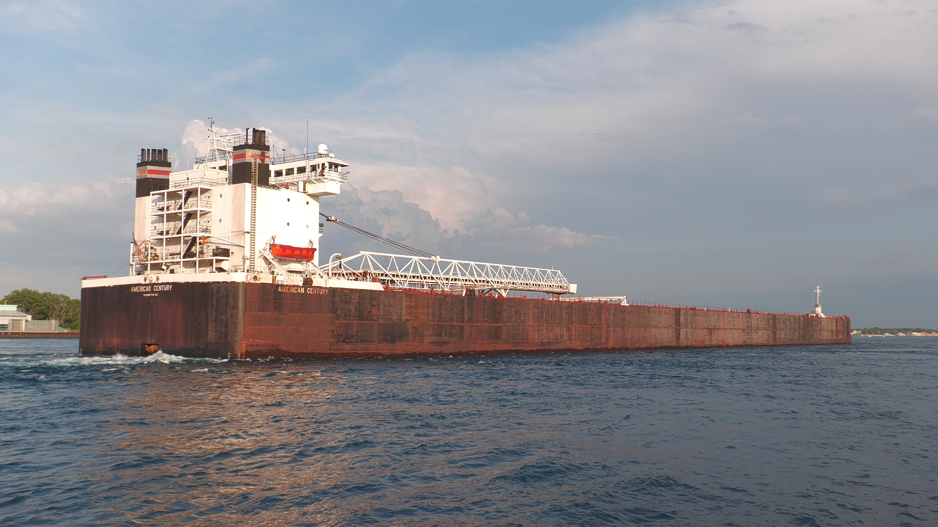 1,000’ Great Lakes freighter American Century(American Steamship Company) gives a horn salute on the St. Clair River. April 11, 2025.