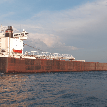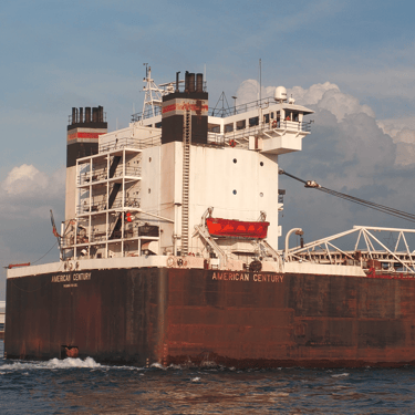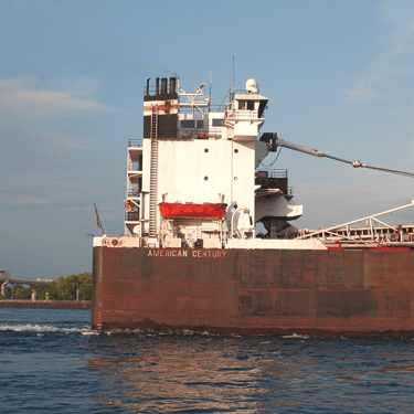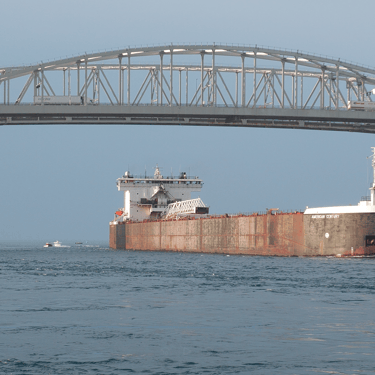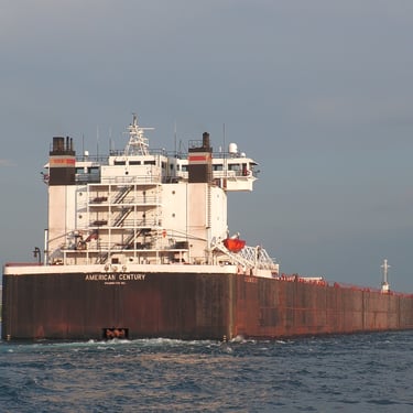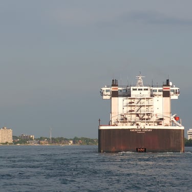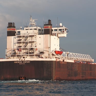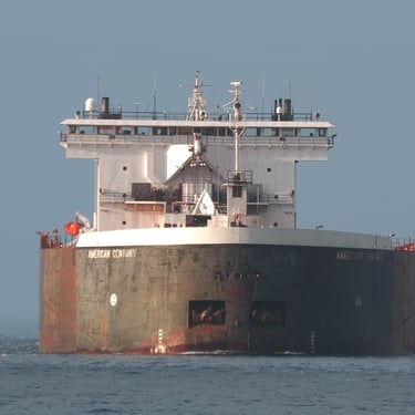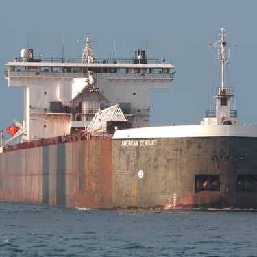 1000' Great Lakes freighter, American Century (American Steamship Company) making the Blue Water bridge turn on the St, Clair River in Port Huron, Michigan. American Century, a self-unloading bulk carrier, is one of 13 1000' long ships on the Great Lakes. September 07, 2024.