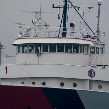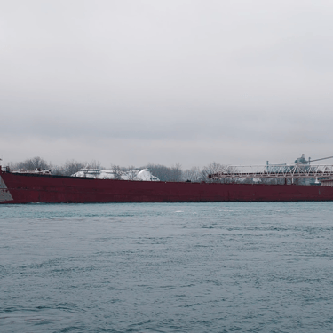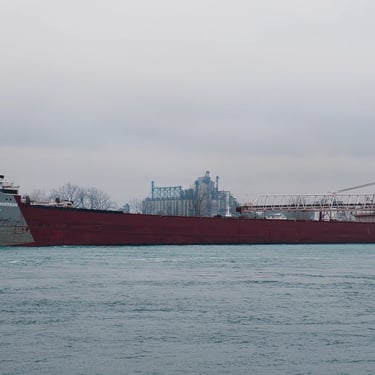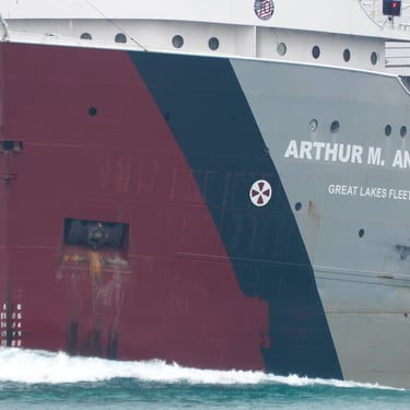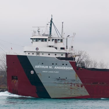 767 Foot long classic Great Lakes freighter Arthur M. Anderson (Great Lakes Fleet) heading upbound on the St. Clair River, passing East China Township, Michigan, on the gloomy 49th anniversary of the tragic sinking of the Edmund Fitzgerald. The Anderson is forever connected to the loss of the Fitzgerald, as she was traveling less than 20 miles behind the Fitzgerald on Lake Superior in that violent November storm in 1975. The last communication heard from the Fitzgerald was a radio call to the Anderson stating, "We are holding our own". Soon after, the Fitzgerald disappeared from the Anderson's radar and was not seen or heard from again, until she was later found on the bottom of Lake Superior near Whitefish Point. All 29 of her crew were lost. November 10, 2024.