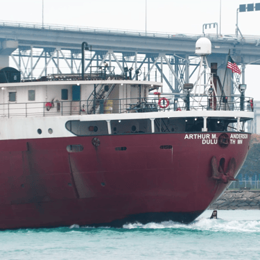 767 Foot long classic Great Lakes freighter Arthur M. Anderson (Great Lakes Fleet) heading upbound on the St. Clair River, passing under the Blue Water Bridge, on the gloomy and solemn 49th anniversary of the tragic sinking of the Edmund Fitzgerald. November 10, 2024.