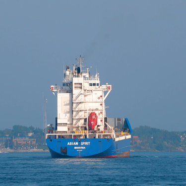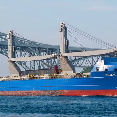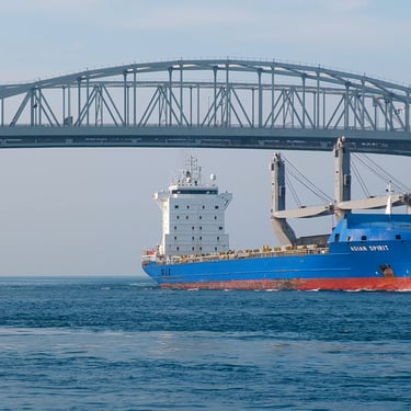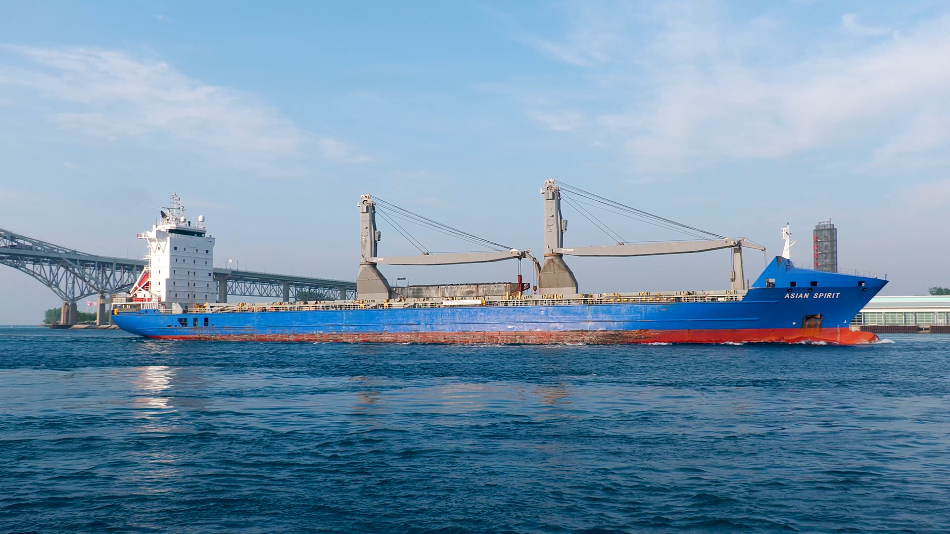 A salute from the 514’ dry bulk carrier, Asian Spirit (Inter Marine) as she comes off of Lake Huron, and passes under the Blue Water Bridge, beginning her voyage down the St. Clair River. Asian Spirit has been delivering wind turbine blades to Duluth, Minnesota throughout the summer. June 07, 2025.