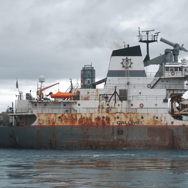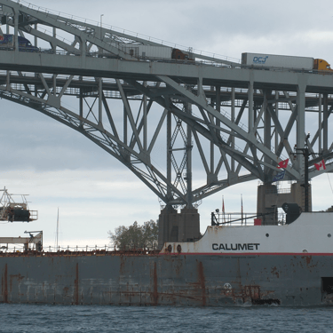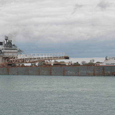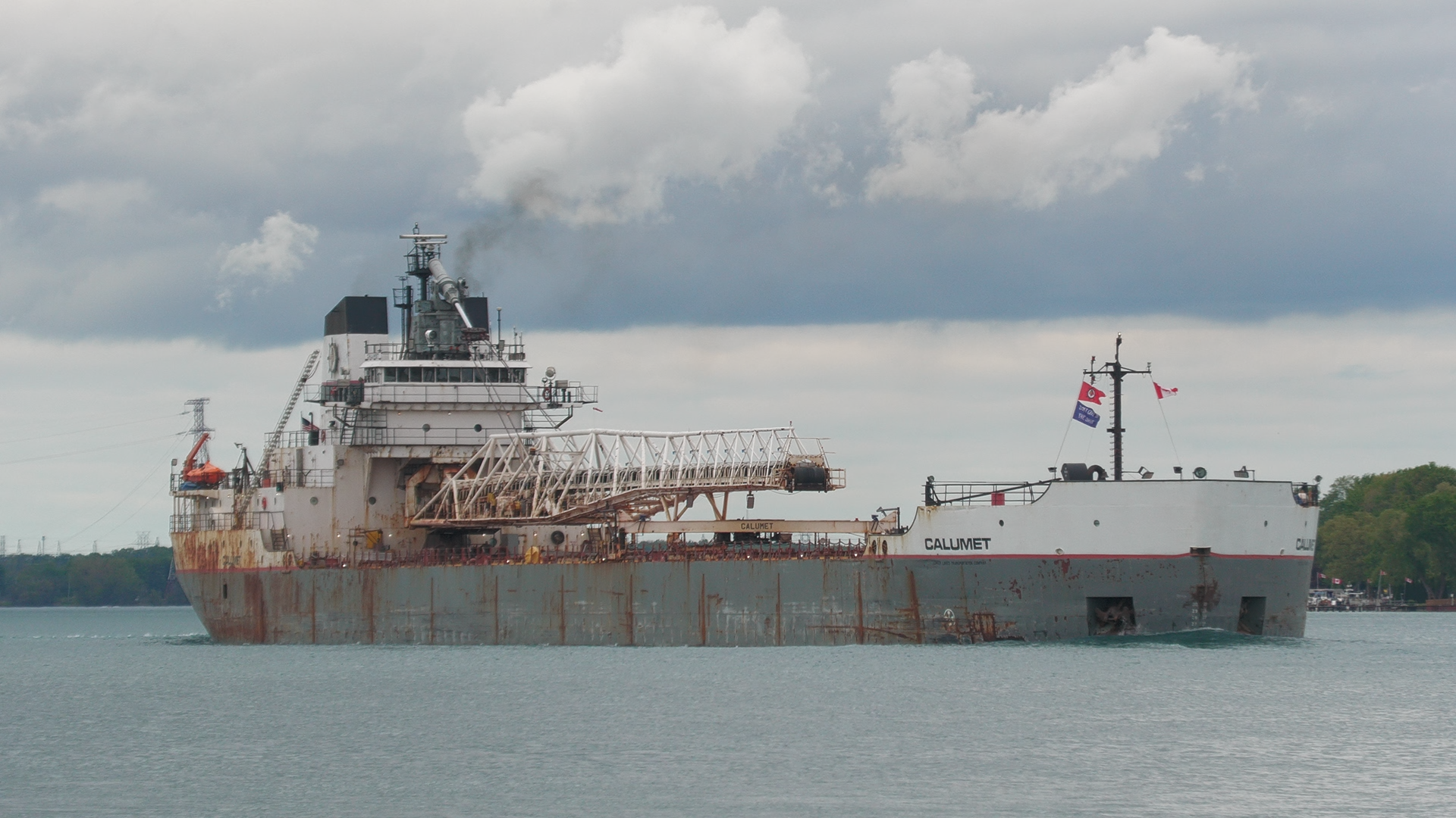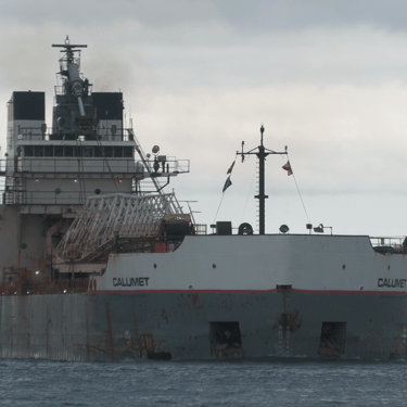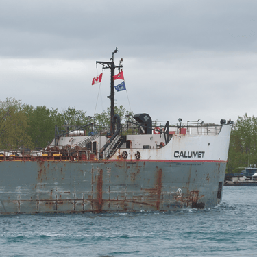 630’ Great Lakes freighter Calumet (Grand River Navigation) downbound on the St. Clair River, passing Marine City, Michigan. May 24, 2025.