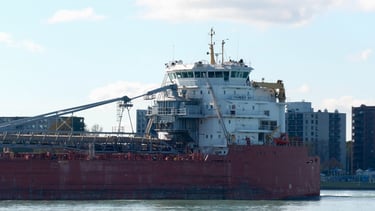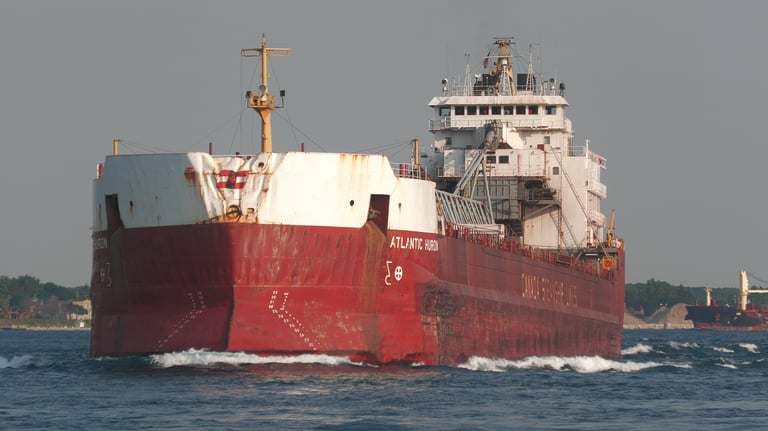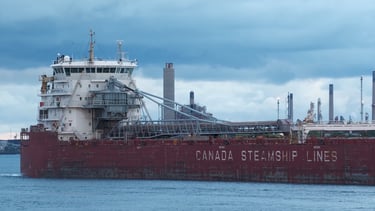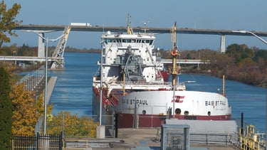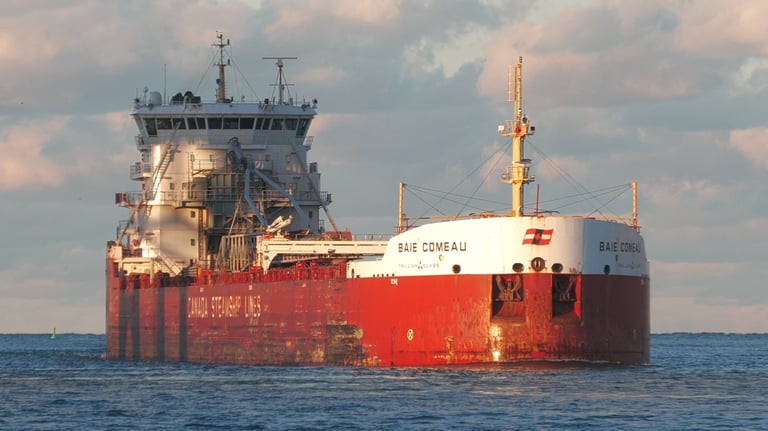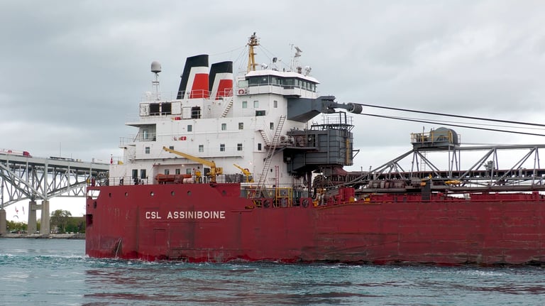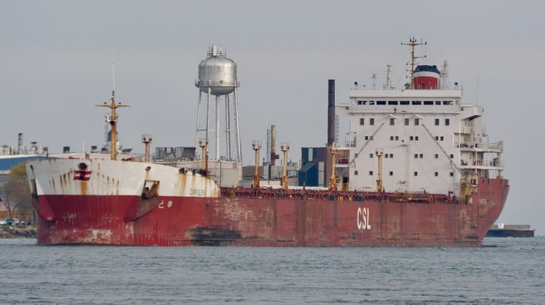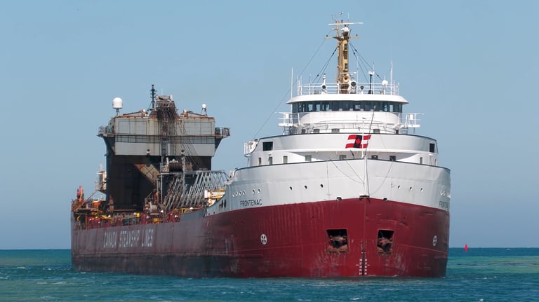 Canada Steamship Lines, headquartered in Montreal, Quebec, was founded in 1913. According to their website, they are "the world’s largest owner and operator of self-unloading vessels, the third-largest operator of cement carriers, and a leader in high-efficiency transhipment solutions." They operate a variety of self-unloading and gearless bulk carriers on the Great Lakes and St. Lawrence Seaway, including the classic lakers Frontenac, and CSL Tadoussac. The fleet is easily recognizable, with their bright red hulls with white trim and lettering.
