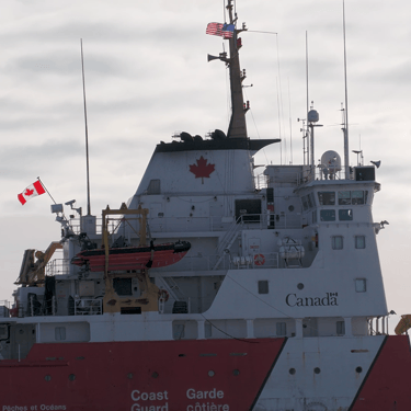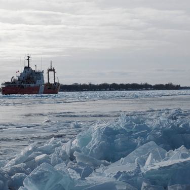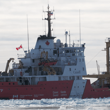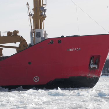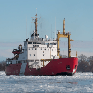 Canadian Coast Guard Ship CCGS Griffon on Great Lakes icebreaking operations, allowing marine traffic to continue flowing on the heavily iced over St. Clair River, in Marine City, Michigan. January 26, 2025.
