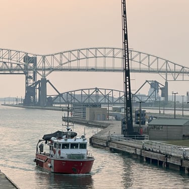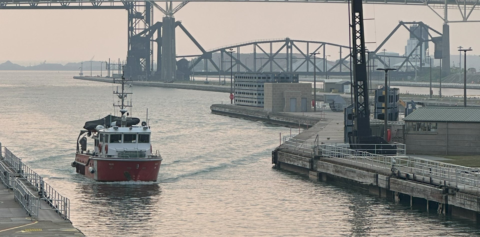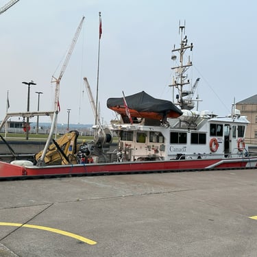 Canadian Coast Guard vessel CCGS Kelso entering the MacArthur Lock, downbound on the St. Marys River, in Sault Ste. Marie, Michigan. August 01, 2025.