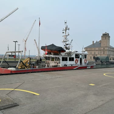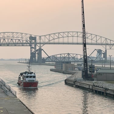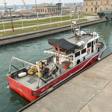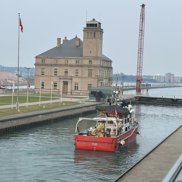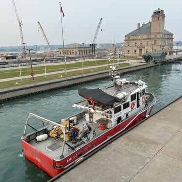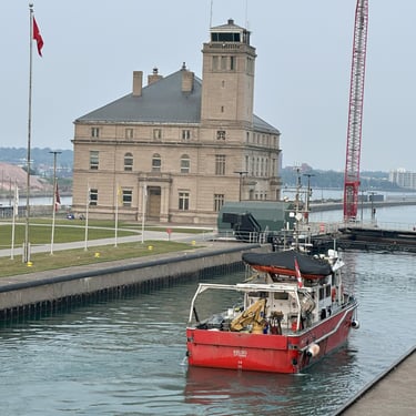 59’ CCGS Kelso, a Canadian Coast Guard science vessel, exits the MacArthur Lock at the Soo Locks, heading downbound on the St. Marys River. August 01, 2025.