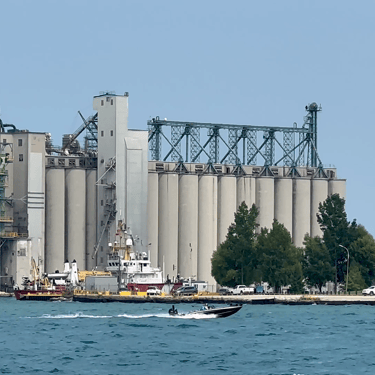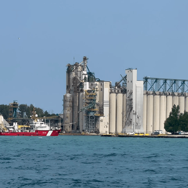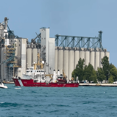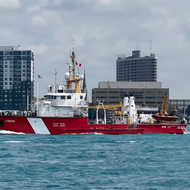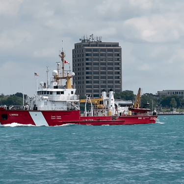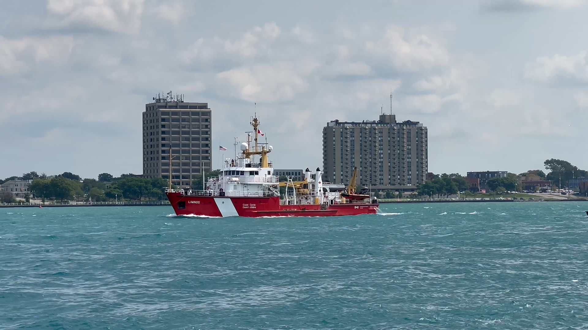 CCGS Limnos, a 147’ Great Lakes coastal research and survey vessel. Viewed from Port Huron, Michigan on the St. Clair River, turning into Sarnia Harbor in Sarnia, Ontario, Canada. August 25, 2024.