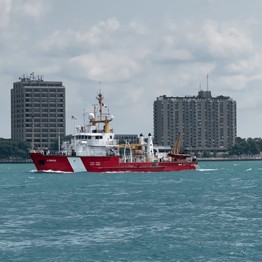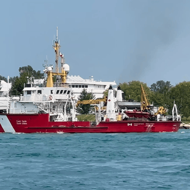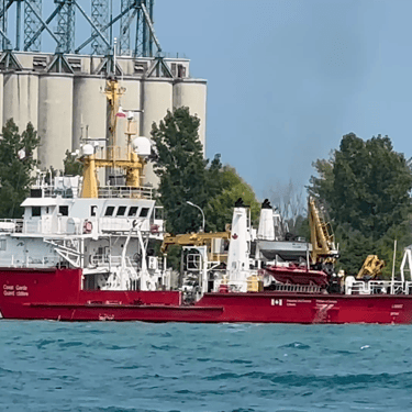 CCGS Limnos, a 147' Great Lakes coastal research and survey vessel. Viewed from Port Huron, Michigan on the St. Clair River, turning into Sarnia Harbor in Sarnia, Ontario, Canada. August 25, 2024.