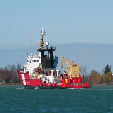 229' Canadian Coast Guard ship Samuel Risley blows 5 short horn blasts at a small fishing boat in the ship channel, after passing under the Blue Water bridges connecting Port Huron, Michigan to Point Edward, Ontario, Canada. April 05, 2025.