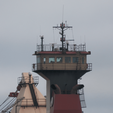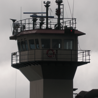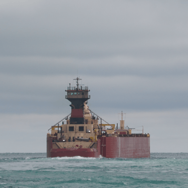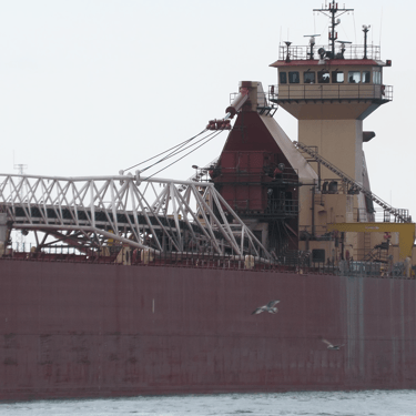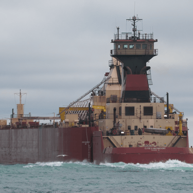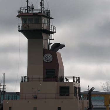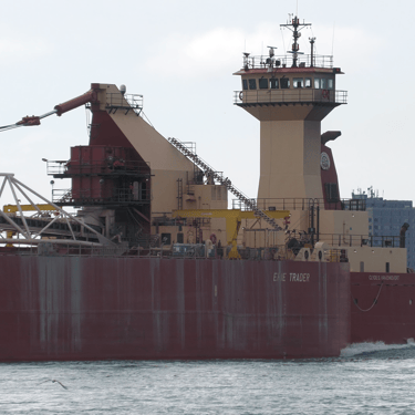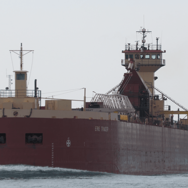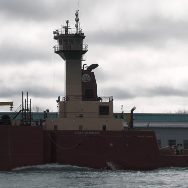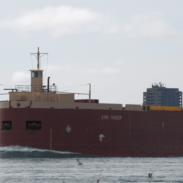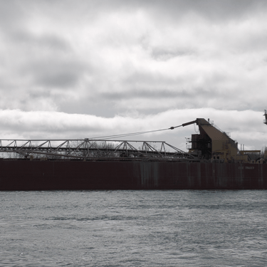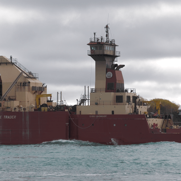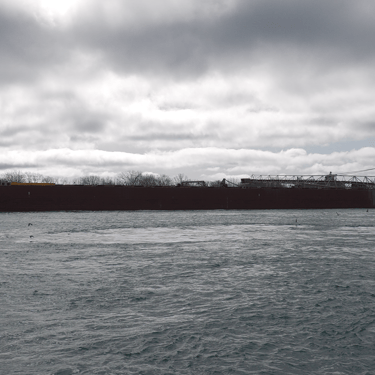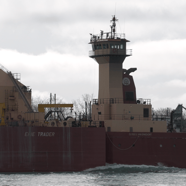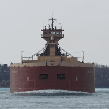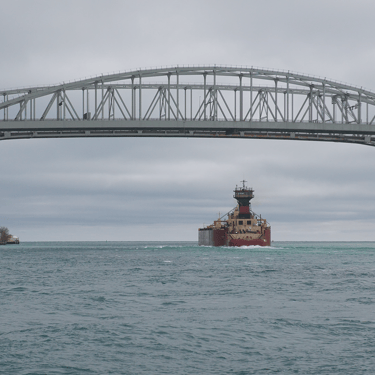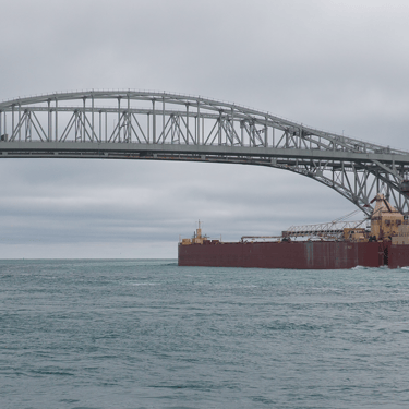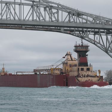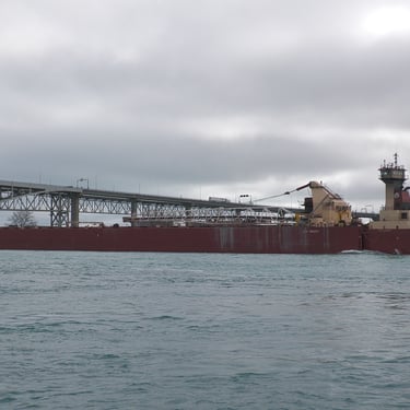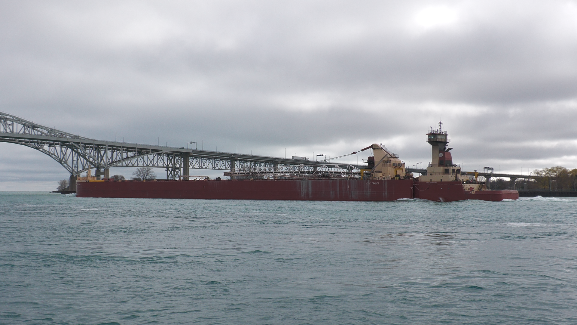 Tugboat Clyde S. VanEnkevort and barge Erie Trader (VanEnkevort Tug & Barge) passing under the Blue Water Bridge, upbound on the St. Clair River. April 20, 2025.