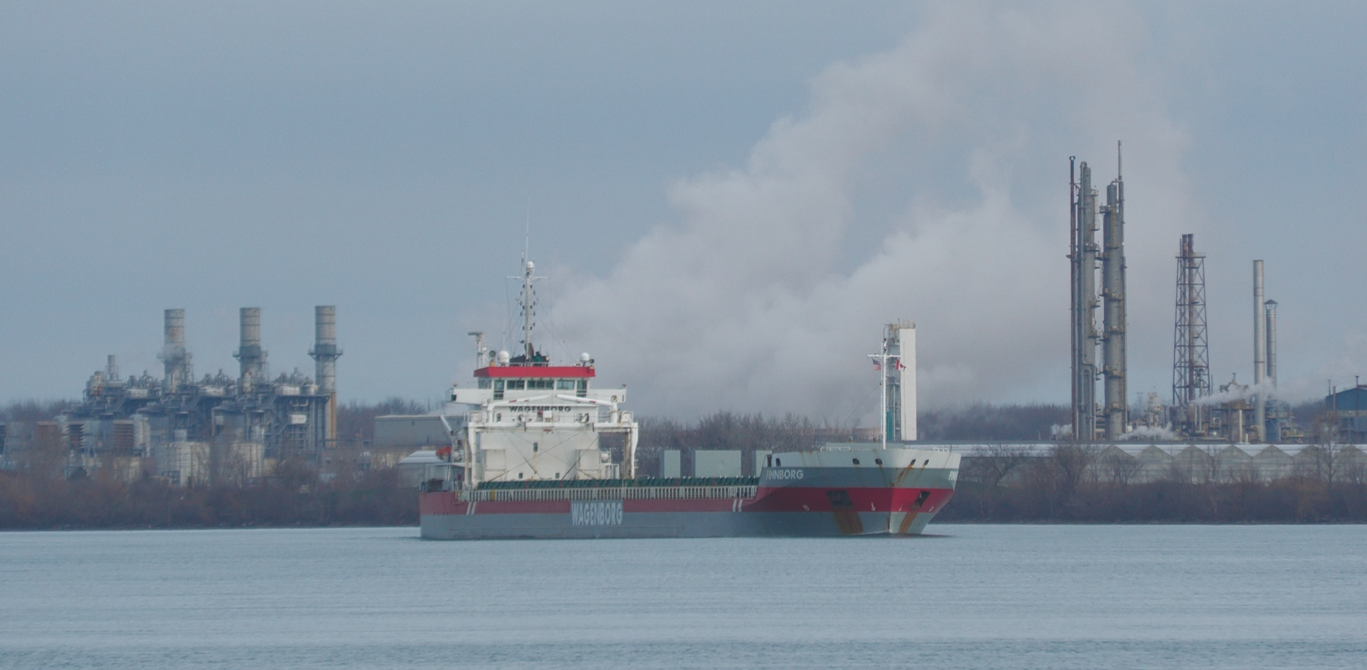 767 Foot long classic Great Lakes freighter Arthur M. Anderson (Great Lakes Fleet) heading upbound on the St. Clair River, passing East China Township, Michigan, on the gloomy 49th anniversary of the tragic sinking of the Edmund Fitzgerald. The Anderson is forever connected to the loss of the Fitzgerald, as she was traveling less than 20 miles behind the Fitzgerald on Lake Superior in that violent November storm in 1975. The last communication heard from the Fitzgerald was a radio call to the Anderson stating, "We are holding our own". Soon after, the Fitzgerald disappeared from the Anderson's radar and was not seen or heard from again, until she was later found on the bottom of Lake Superior near Whitefish Point. All 29 of her crew were lost. November 10, 2024.