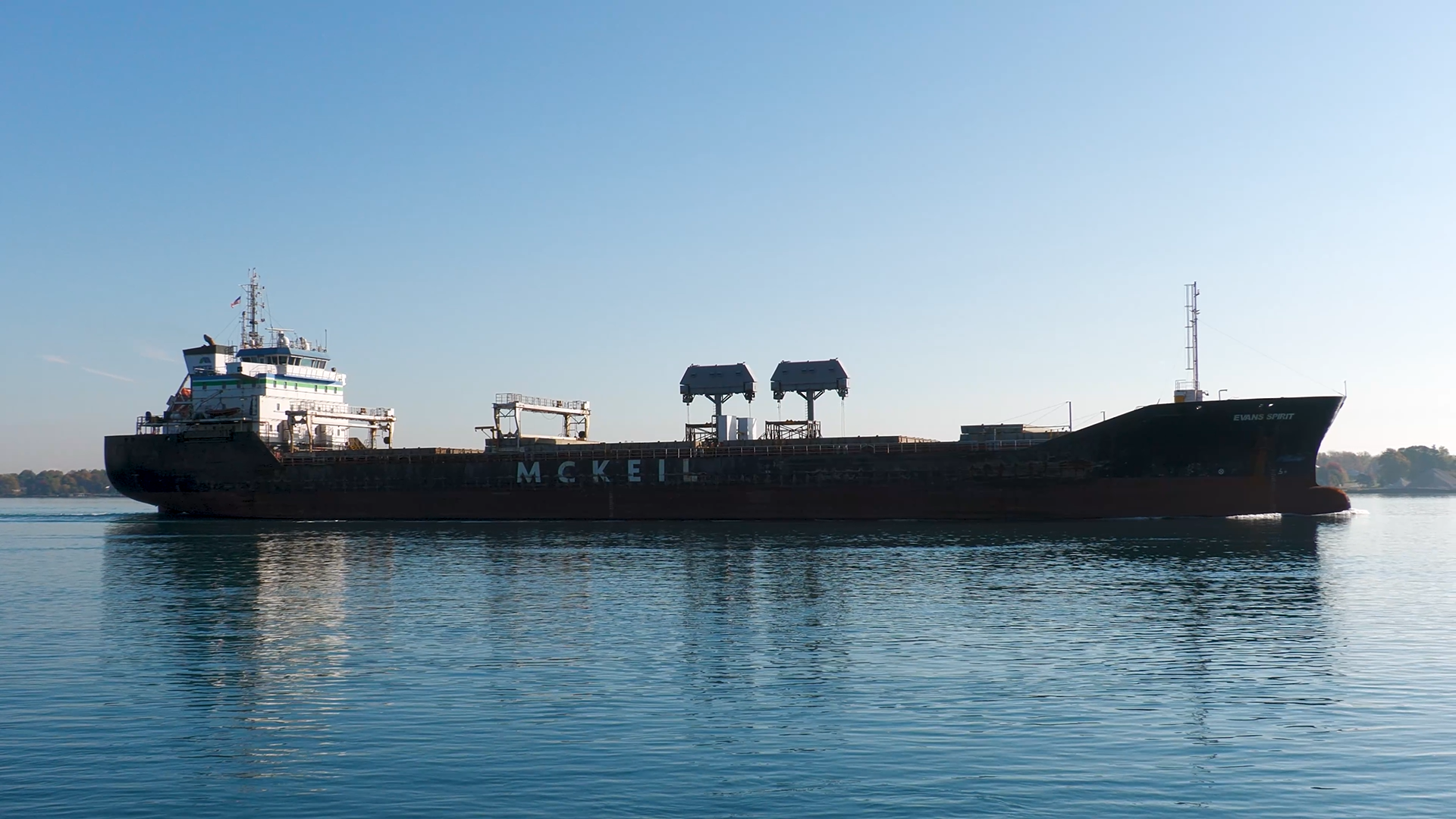 459’ Great Lakes bulk freighter Evans Spirit (McKeil Marine) heading down the St. Clair River on a sunny fall day. This 4k video was recorded October 14, 2025, in St. Clair, Michigan.