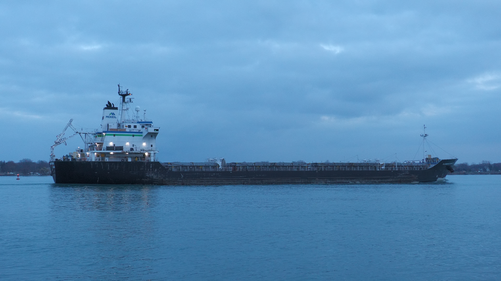 A twilight salute with a big echo! The 446’ 7” Florence Spirit (McKeil Marine) down-bound on the St. Clair River. Recorded November 24, 2024.