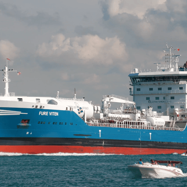 Beautiful tanker ship Fure Viten travels up the St. Clair River, passing St. Clair, Michigan, on a sunny Sunday evening. July 20, 2025.