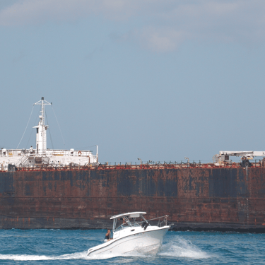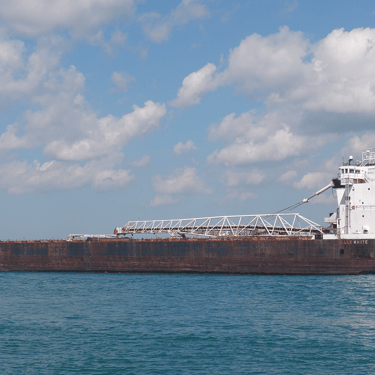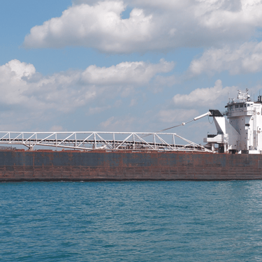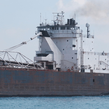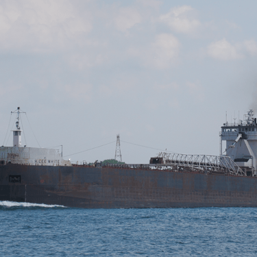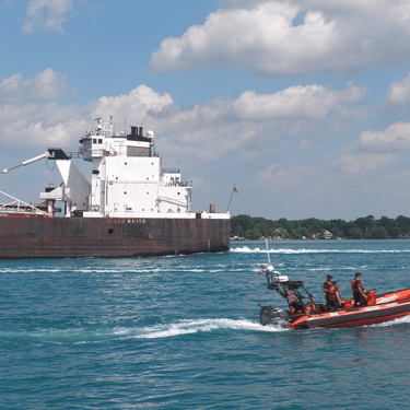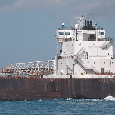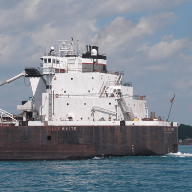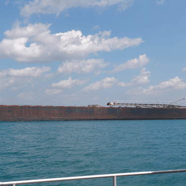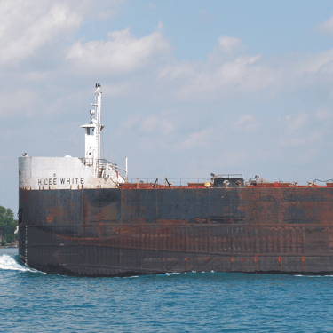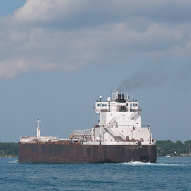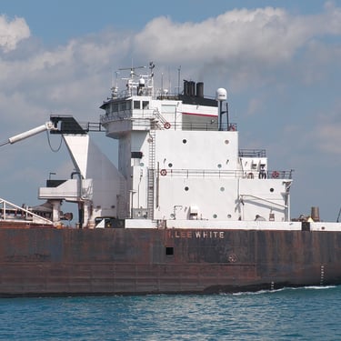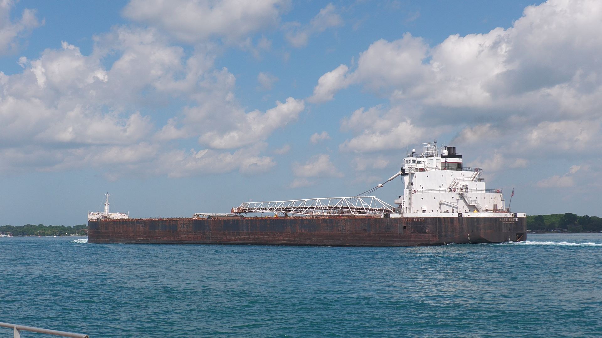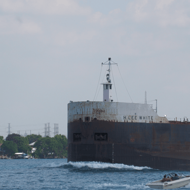 704’ Freighter H. Lee White upbound on the St. Clair River, passing through the St. Clair River Classic offshore powerboat races. St. Clair, Michigan, July 27, 2025.