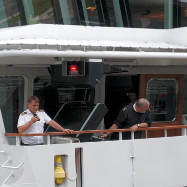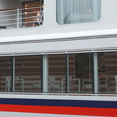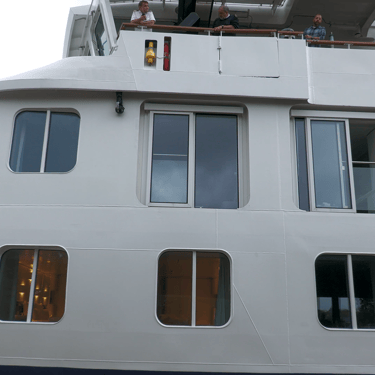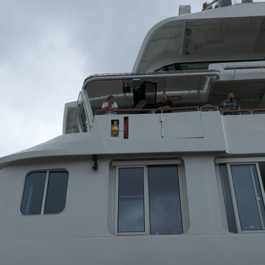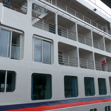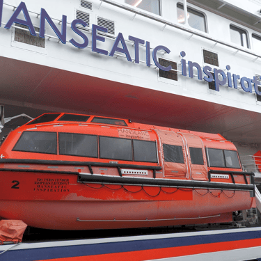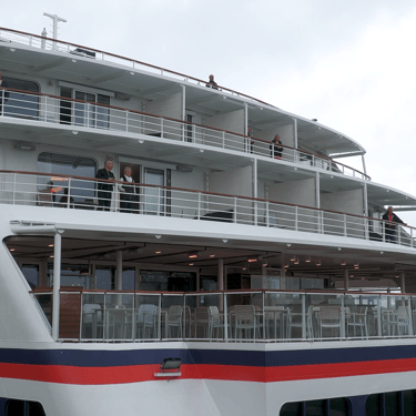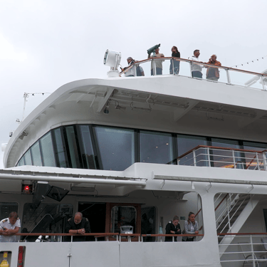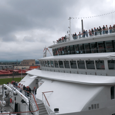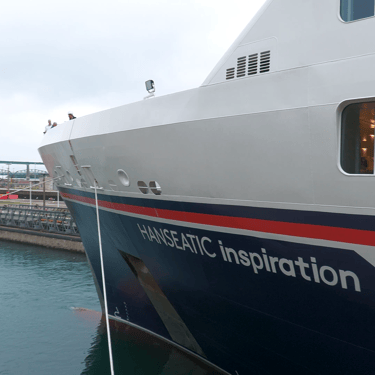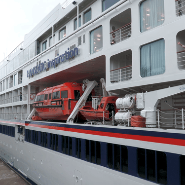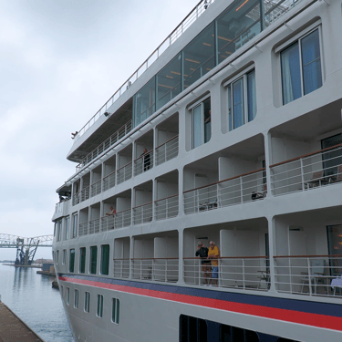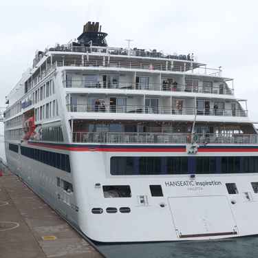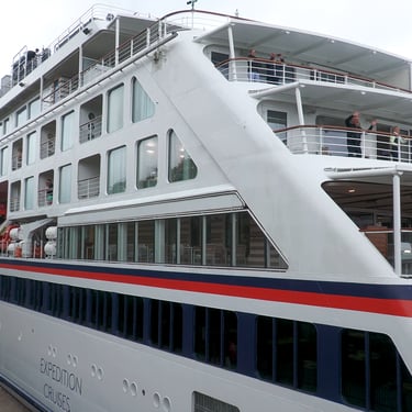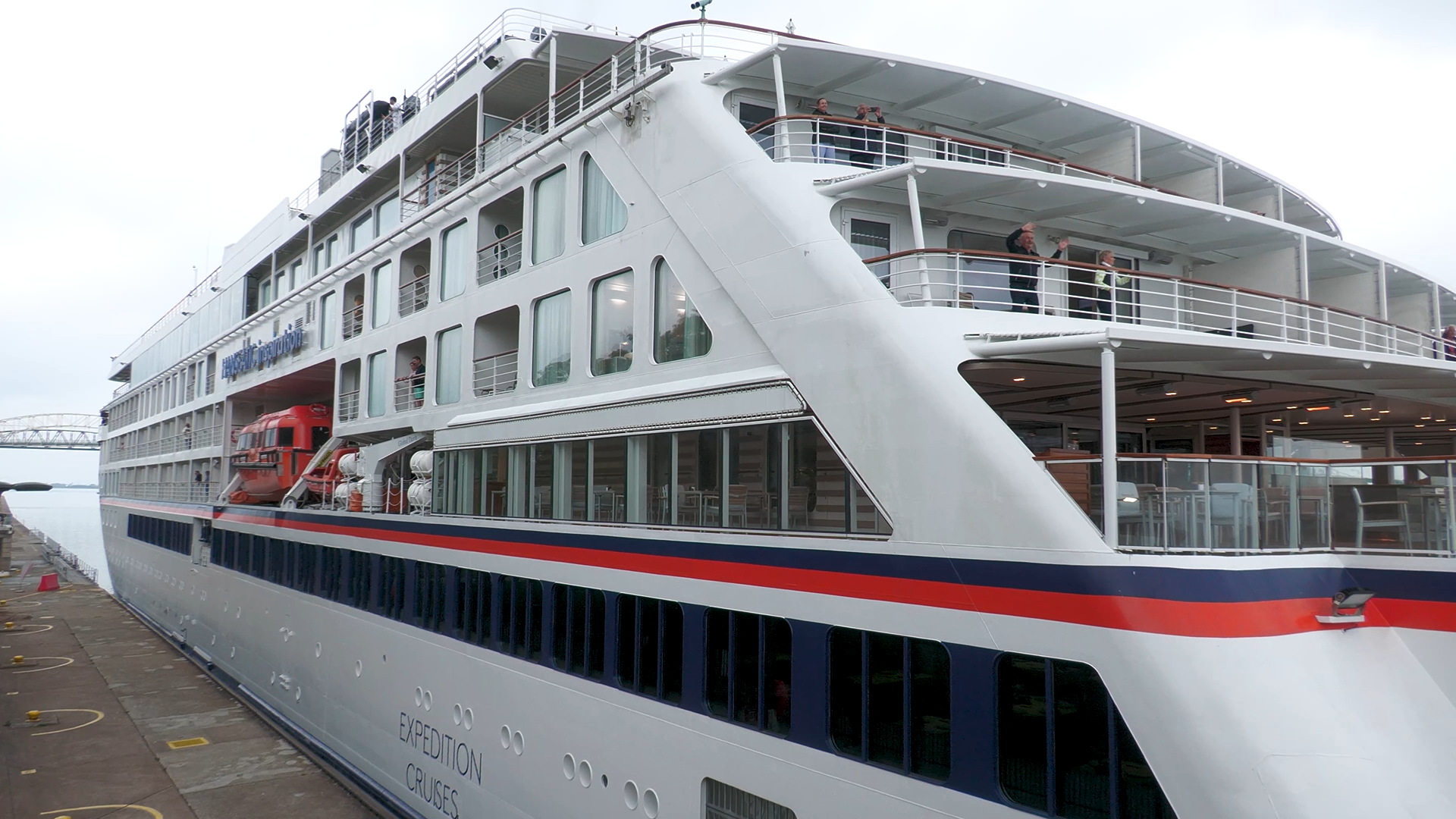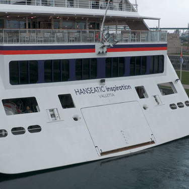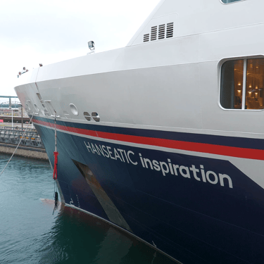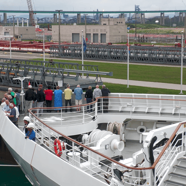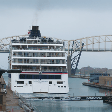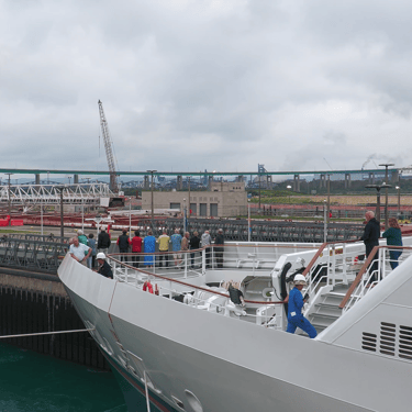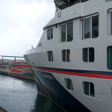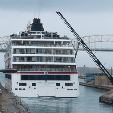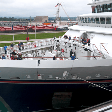 Luxury expedition cruise ship, MS Hanseatic Inspiration (Hapag-Lloyd Cruises), on a freshwater adventure, cruising the Great Lakes, navigating through the MacArthur Lock at the iconic Soo Locks in Sault Ste. Marie, Michigan. This beautiful vessel is being raised 21 feet as she moves into Lake Superior from Lake Huron, via the St. Marys River. September 22, 2024.