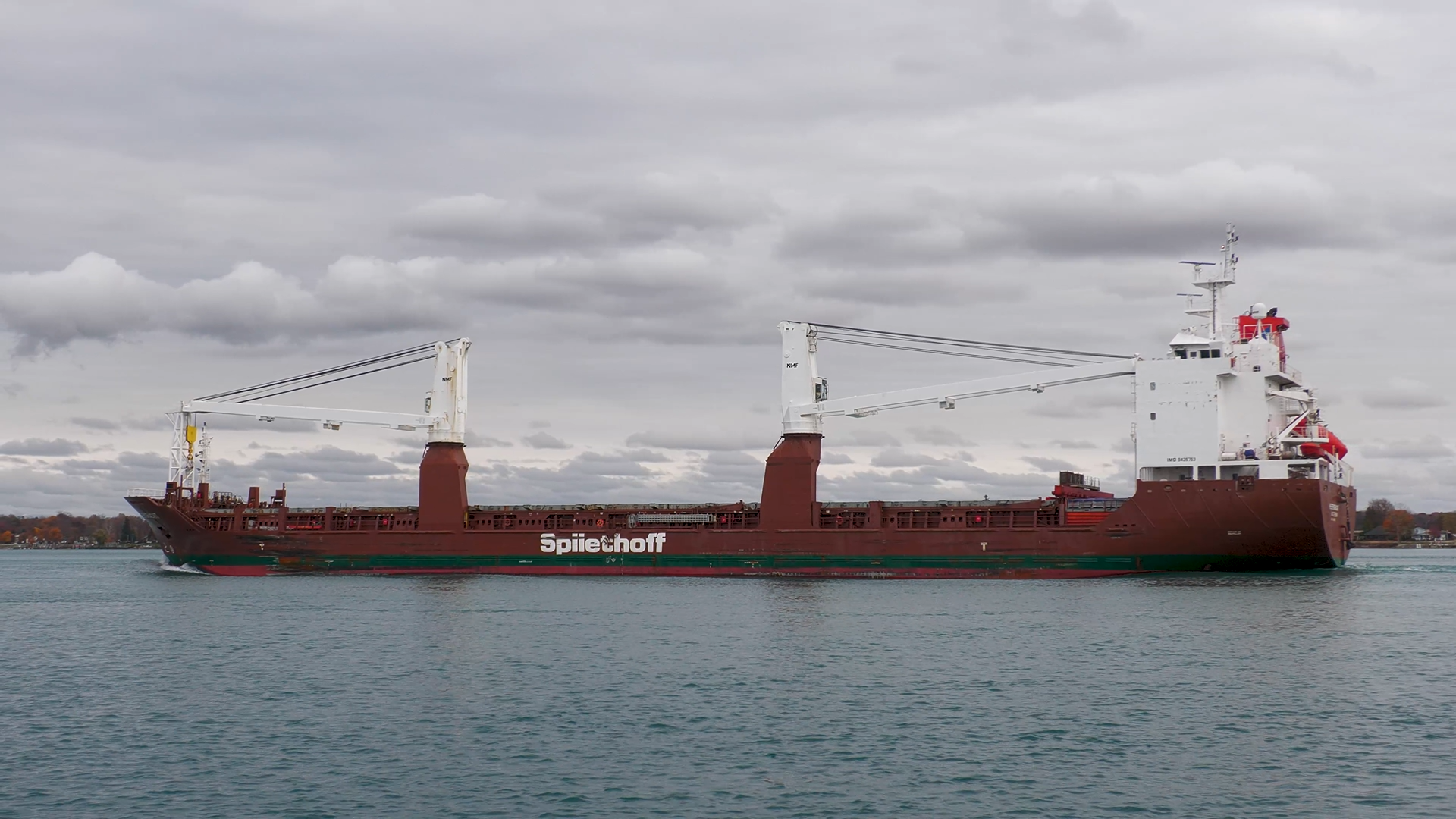 Dutch heavy lift cargo ship Heerengracht (Spliethoff) stands out with her huge deck cranes, as she heads up the St. Clair River on a Great Lakes voyage to Duluth, Minnesota. This 4k video was recorded in St. Clair, Michigan, November 08, 2025.