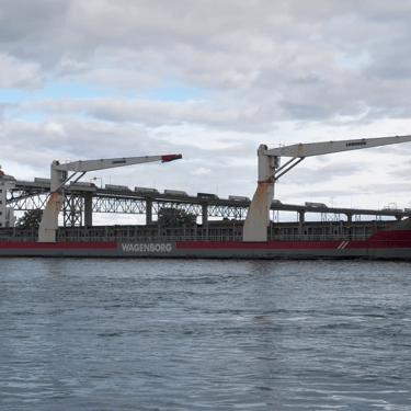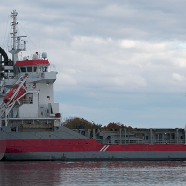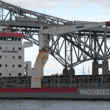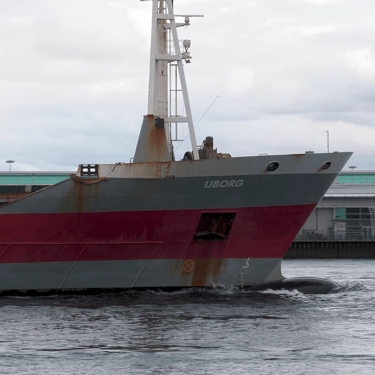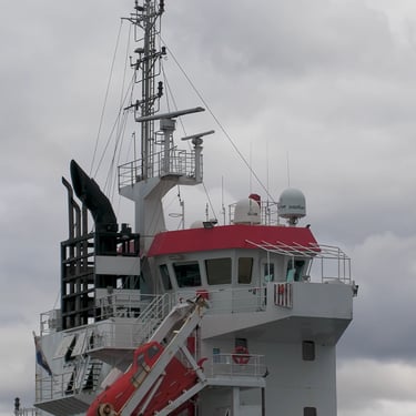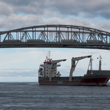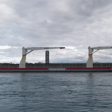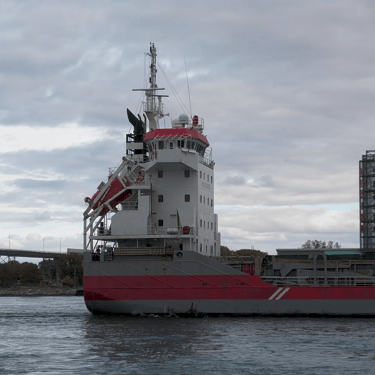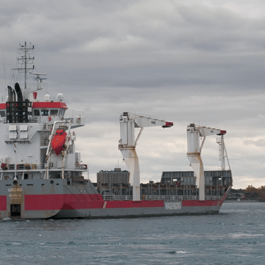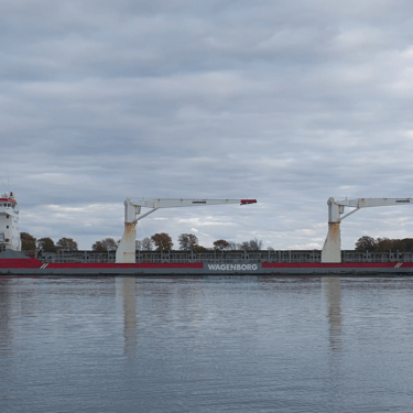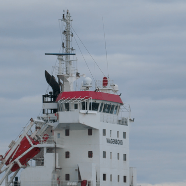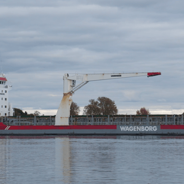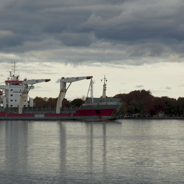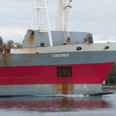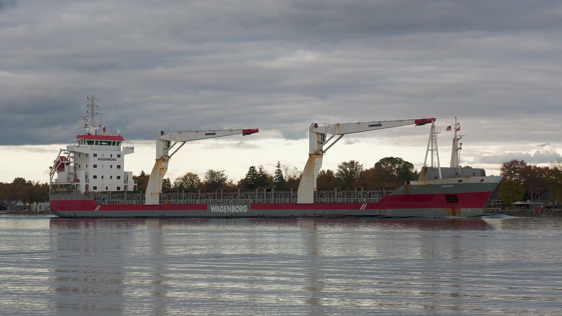 469' Dutch cargo ship Ijborg (Royal Wagenborg) downbound on the St. Clair River, passing Algonac, Michigan. With a small fishing boat passing by and some nice reflections on the calm water. October 25, 2025.