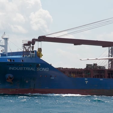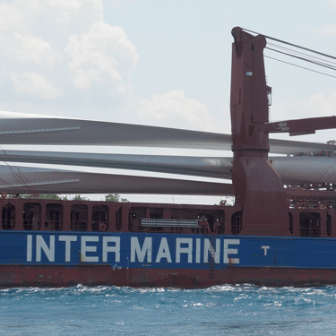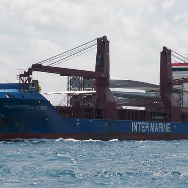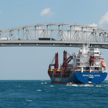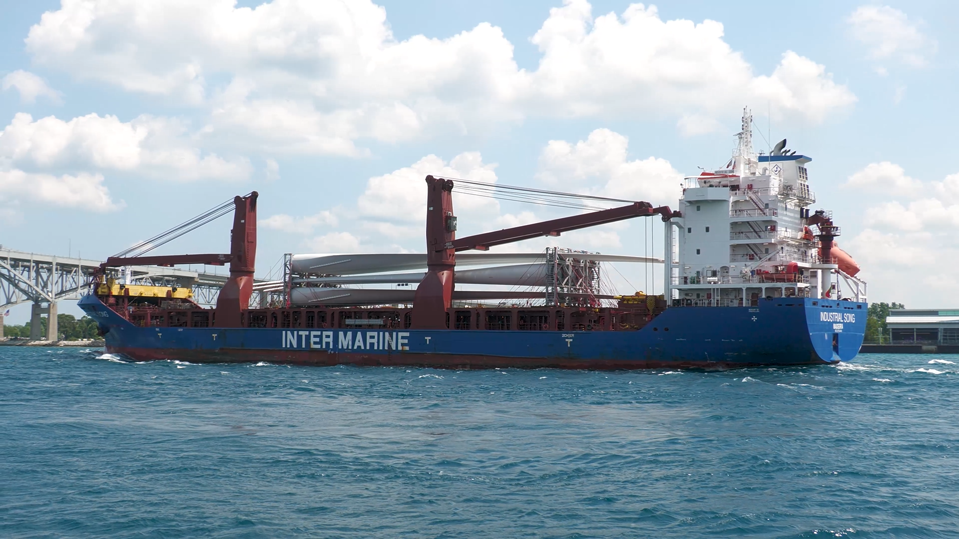 475' Industrial Song (Inter Marine) up-bound on the St. Clair River, at the Blue Water Bridge on a rough and windy day. She is hauling wind turbine blades to Indiana. Huron Lightship gives her a salute, but it goes unanswered. Port Huron, Michigan, July 12, 2025.