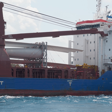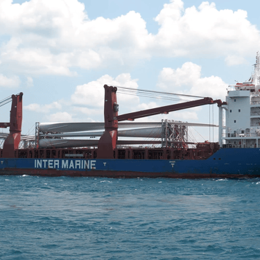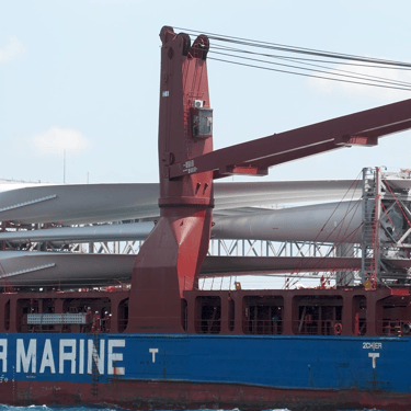 Industrial Song Passes Under the Blue Water Bridge with a Load of Wind Turbine Blades