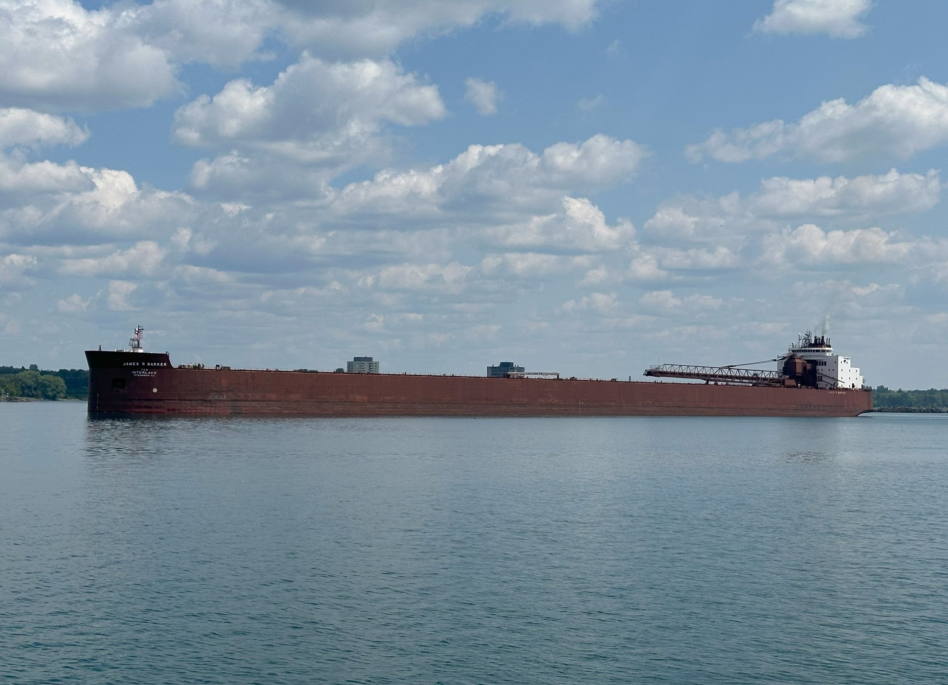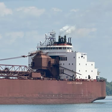The BARKER BARK! A salute from the 1,004’ James R. Barker, upbound on the St. Marys River, at Mission Point. Sault Ste. Marie, Michigan, July 31, 2025.