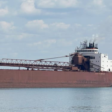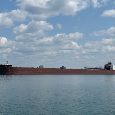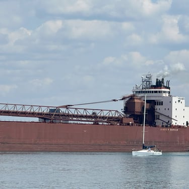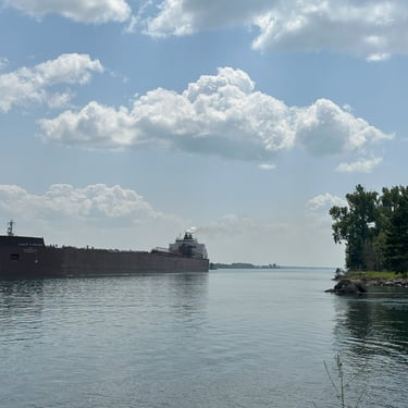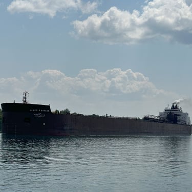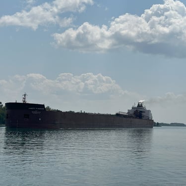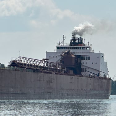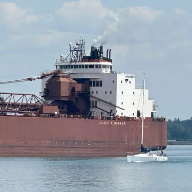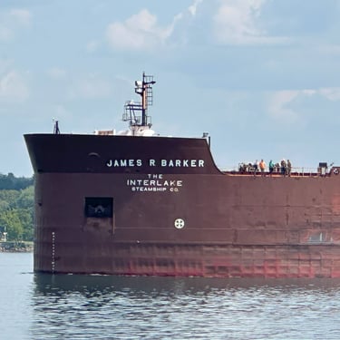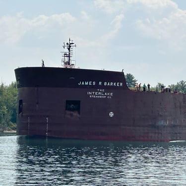 The best ship horn on the Great Lakes! 1,004' James R. Barker (Interlake Steamship Company) answers a salute from Bide-A-Wee (Original Soo Locks Boat Tours), on the St. Marys River, as she slowly approaches the Soo Locks. July 31, 2025.