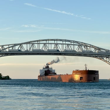 1,004’ James R. Barker (Interlake Steamship Company) passing under the Blue Water Bridge bathed in the low sun. July 21, 2025.