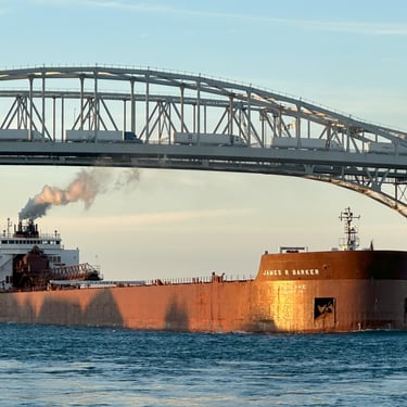 1004' Great Lakes freighter, James R. Barker (Interlake Steamship Company), passing under the International Blue Water Bridges, connecting Port Huron, Michigan, USA to Sarnia, Ontario, Canada. The massive ship is coming off of Lake Huron and proceeding down bound on the St. Clair River, with a load of coal for the DTE power plant in St. Clair, Michigan. December 28, 2024.