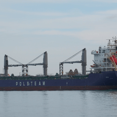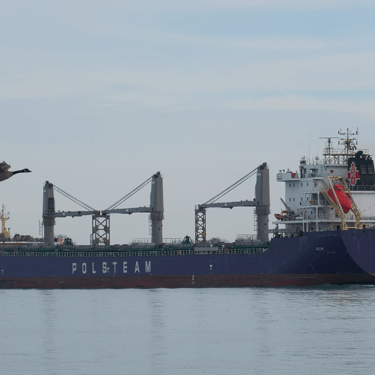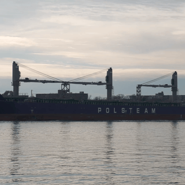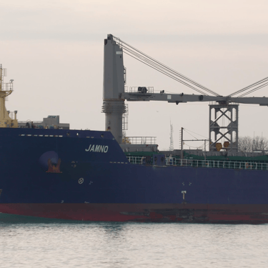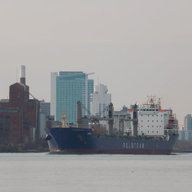 656 Foot long saltwater ship (general cargo vessel/freighter) Jamno (Polsteam) navigating the Detroit River as she traverses the Great Lakes enroute to Burns Harbor, Indiana. This vessel was built in 2018 and has previously been known as Mont Logan and Yang Zi Jiang 015. This 4k video was recorded on from Belle Isle in Detroit, Michigan. The skyline of Windsor, Ontario, Canada is seen in the background. November 27, 2024.