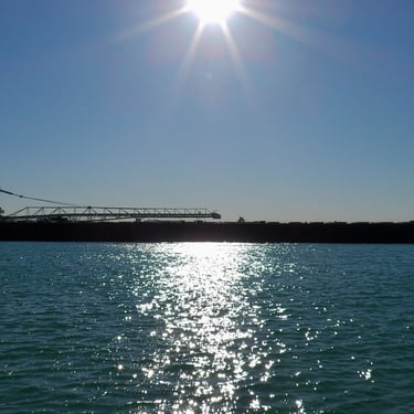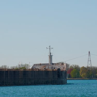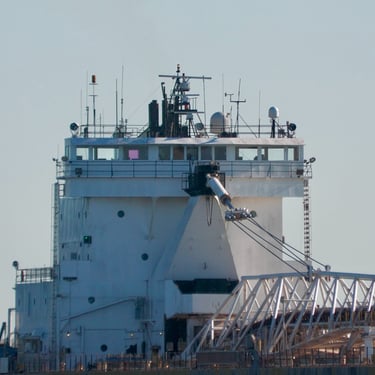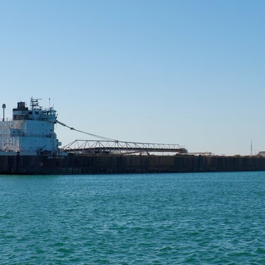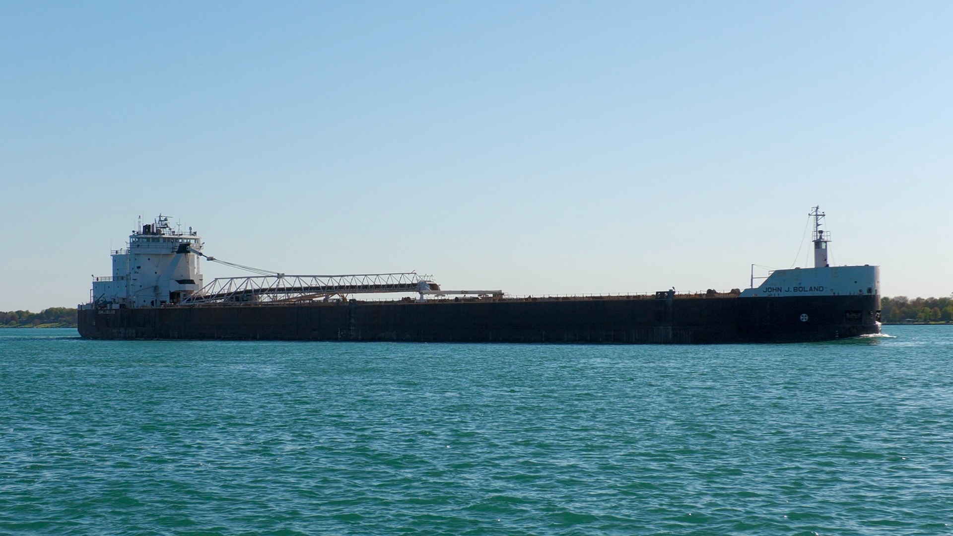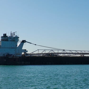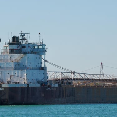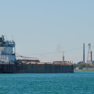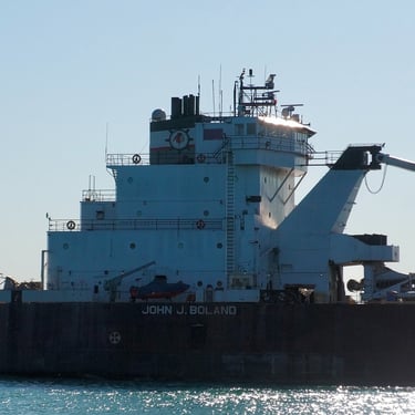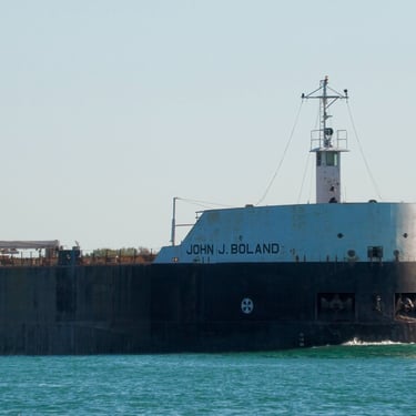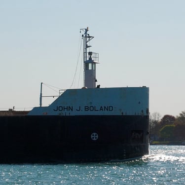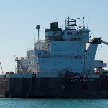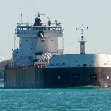 Great Lakes freighters and Grand River Navigation fleet mates, 680' John J. Boland and 815' tug-barge Victory-Maumee meet on the St. Clair River and exchange a hearty salute and a hoot, in Marine City, Michigan. Near the end, the 1,004' freighter Mesabi Miner is seen unloading coal at the DTE plant. May 11, 2025.