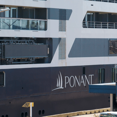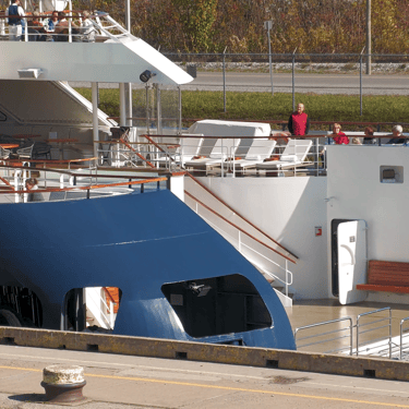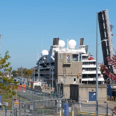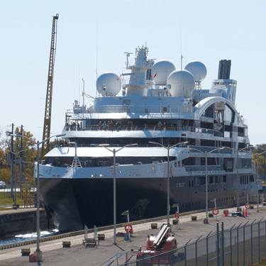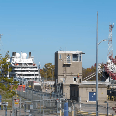 Great Lakes cruise ship, Le Bellot, in the Welland Canal, downbound in Lock 8. The Welland Canal is used to bypass Niagara Falls when transiting from Lake Erie to Lake Ontario. Port Colborne, Ontario, Canada. October 19, 2024.