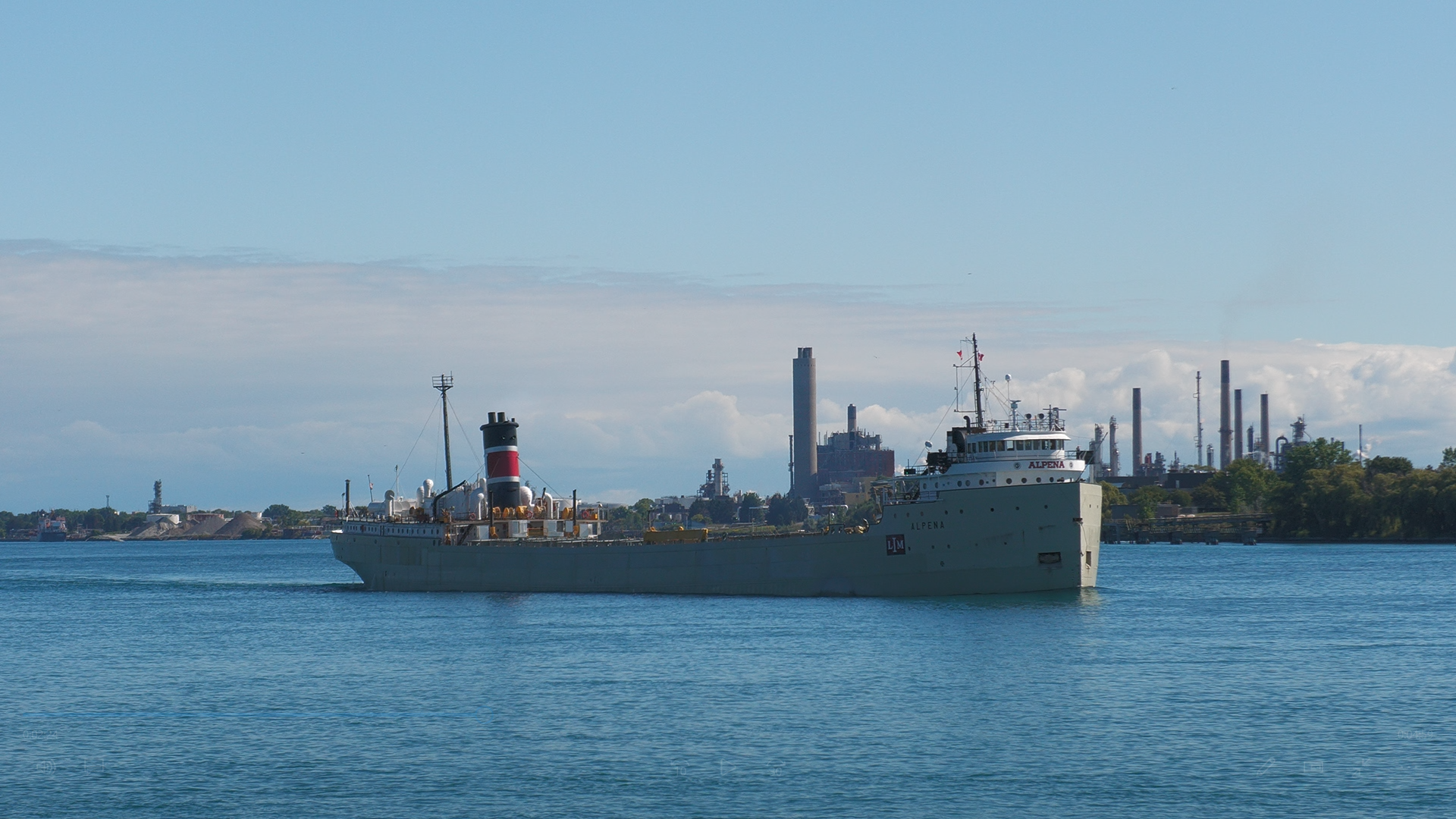 469’ Great Lakes tanker Algoberta (Algoma Central Corporation) heading upbound on the St. Clair River, passing Marysville, Michigan and Sarnia, Ontario, Canada. May 24, 2025.