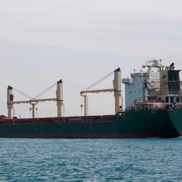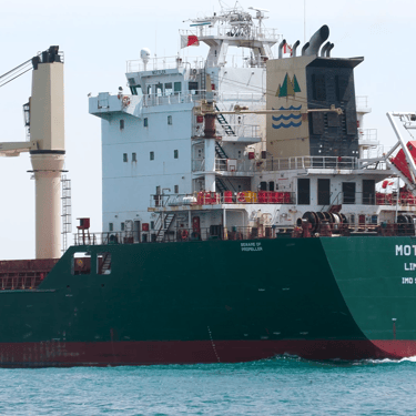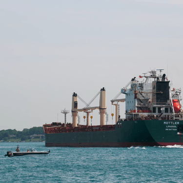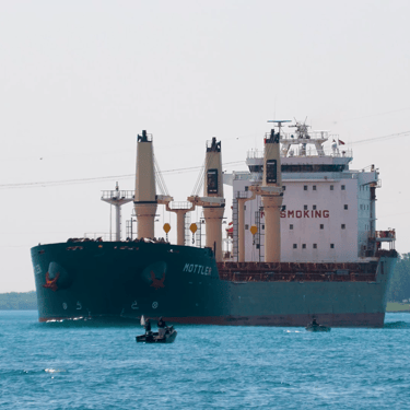 3 Sets of warning blasts from the 607' saltwater ship Mottler (Canfornav), as she heads up the St. Clair River on a sunny Sunday morning, in St. Clair, Michigan. June 15, 2025.