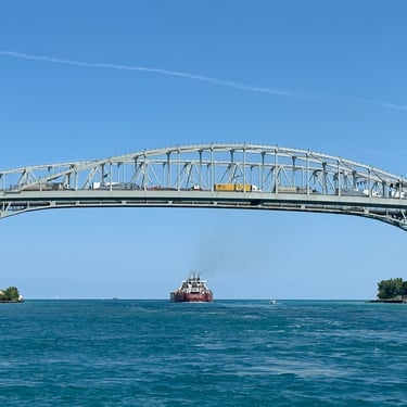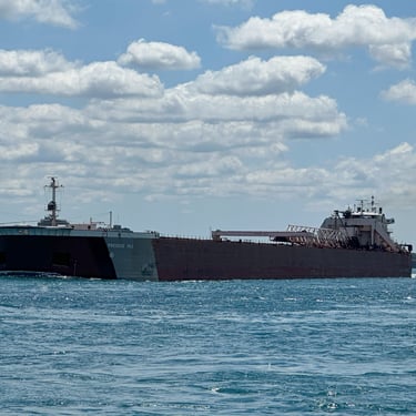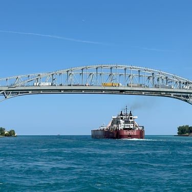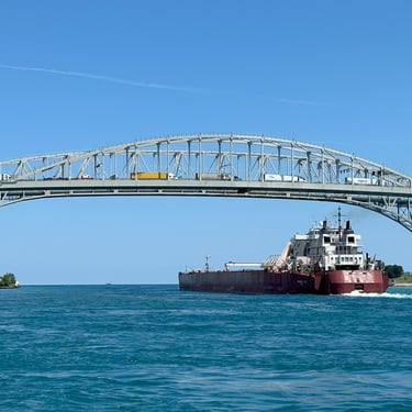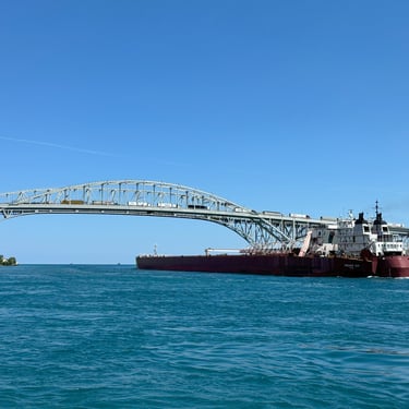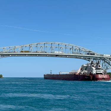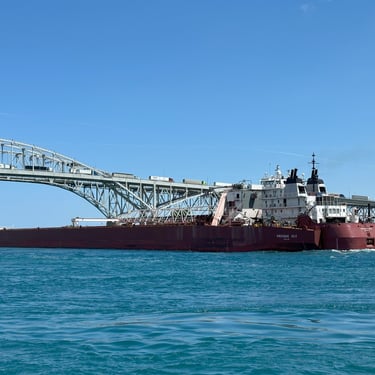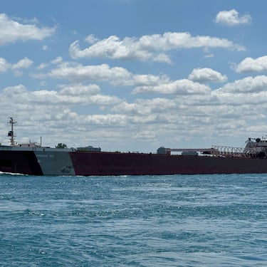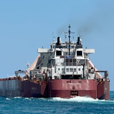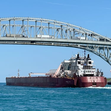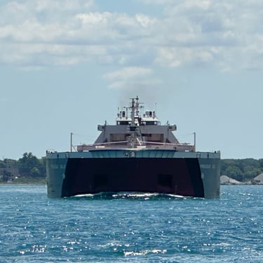 At 1,000' in length, the Presque Isle of the Great Lakes Fleet, is the biggest integrated tug-barge (ITB) on the Great Lakes! In this video, you'll see her heading up-bound on the St. Clair River, passing under the international Blue Water Bridge that connects Port Huron, Michigan to Point Edward, Ontario, Canada. She gives 2 beautiful horn salutes as she passes Port Huron and sails off onto Lake Huron. The freighter Sam Laud is seen following close behind. July 22, 2025.