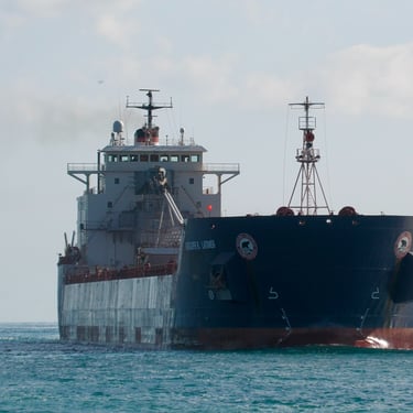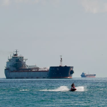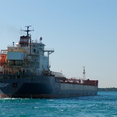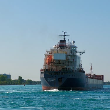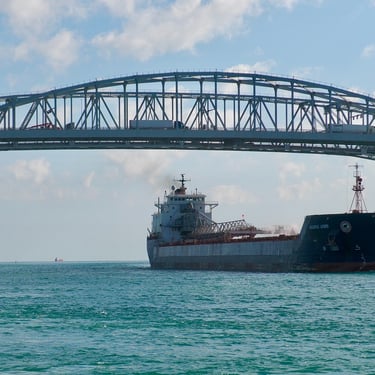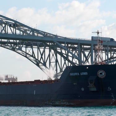 Radcliffe R. Latimer (Algoma Central Corporation) running her deck sprayers, as she passes by the Blue Water Bridge on a hot summer day. July 22, 2025.