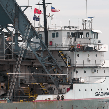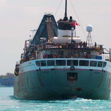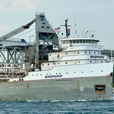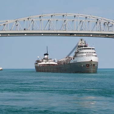 Beautiful 639' classic Great Lakes freighter Saginaw (Lower Lakes Towing) blows a Great Lakes ship horn salute, in the shadows of the international Blue Water Bridge, which connects Port Huron, Michigan to Point Edward, Ontario, Canada. The ship is coming off of Lake Huron and heading downbound on the St. Clair River. May 10, 2025.