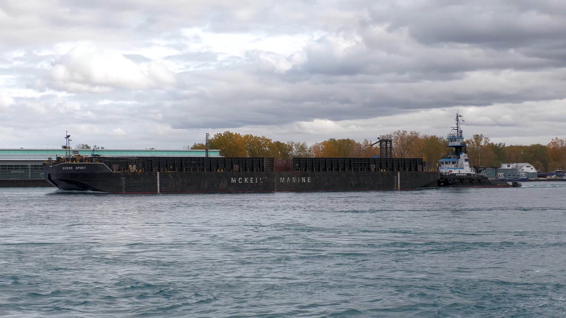 Tugboat Meredith Ashton (Ashton Marine) assisting tugboat Sharon M I (McKeil Marine) with barge Huron Spirit, downbound on the Detroit River. Belle Isle, Detroit, Michigan, September 11, 2025.