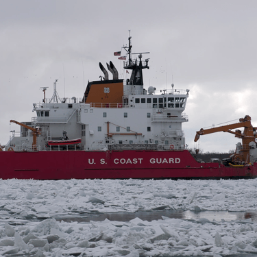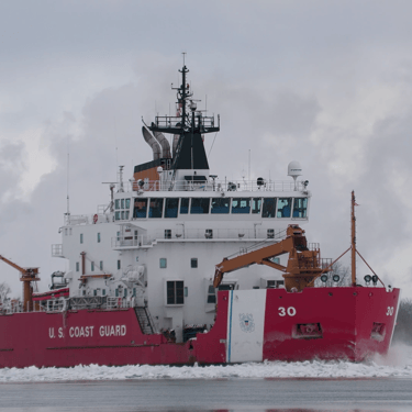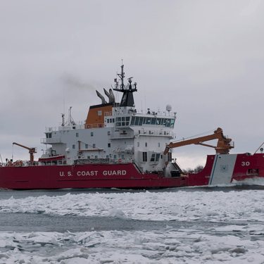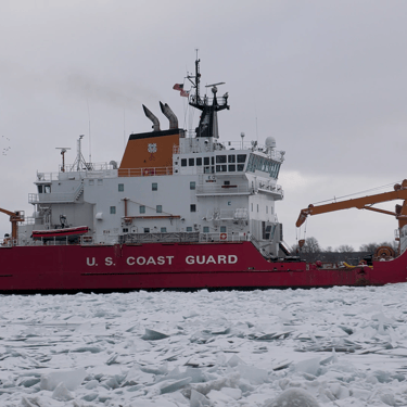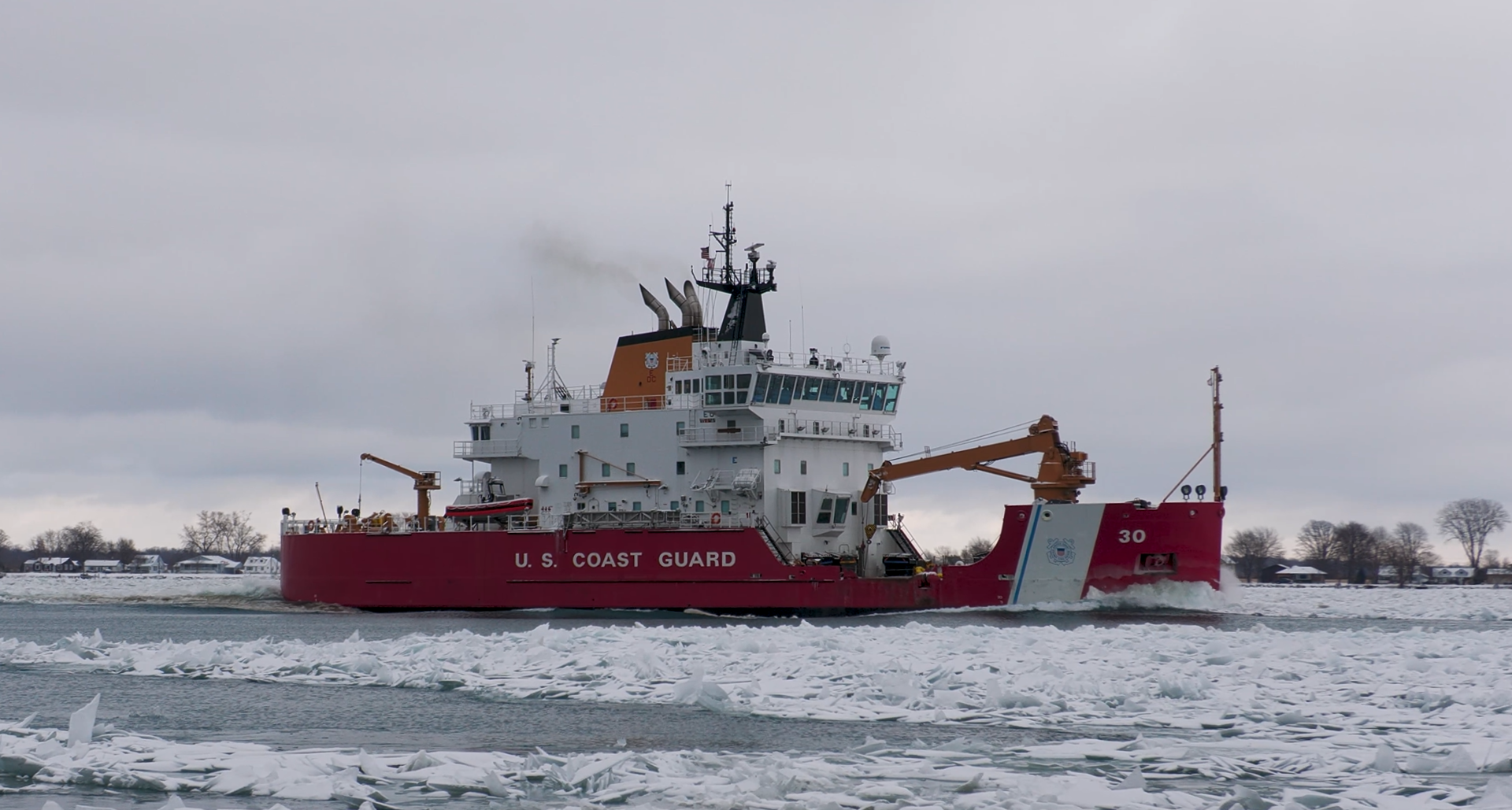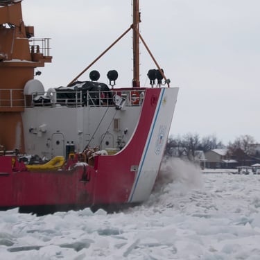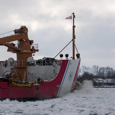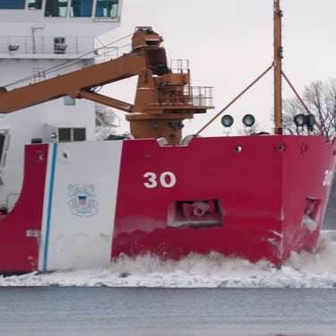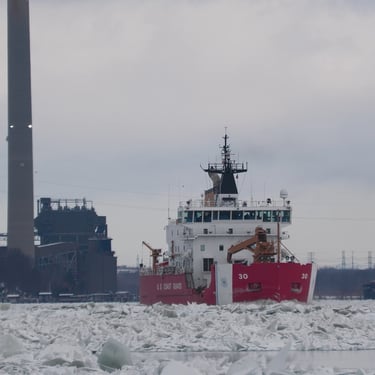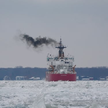 USCG Icebreaker Mackinaw Crushing Ice! United States Coast Guard Ship USCGC Mackinaw on Great Lakes icebreaking operations, escorting the tankers Algoluna (Algoma Central Corporation) and Algocanada (Algoma Central Corporation) down the ice jammed St. Clair River, in Marine City, Michigan. February 09, 2025.