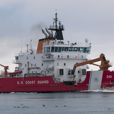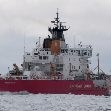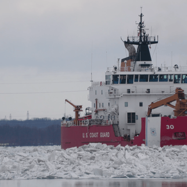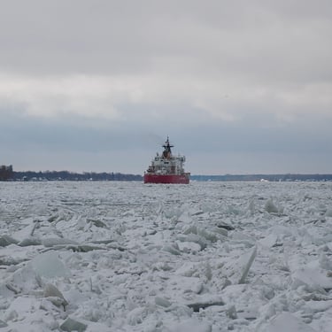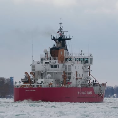 United States Coast Guard Ship USCGC Mackinaw on Great Lakes icebreaking operations, escorting the tankers Algoluna (Algoma Central Corporation) and Algocanada (Algoma Central Corporation) down the ice jammed St. Clair River, in Marine City, Michigan. February 09, 2025.