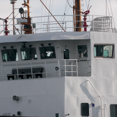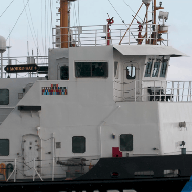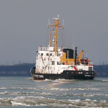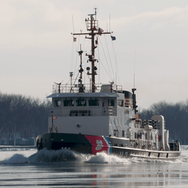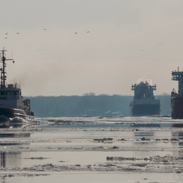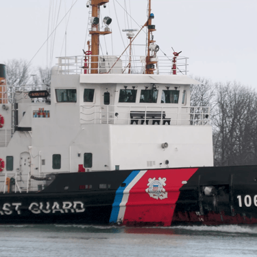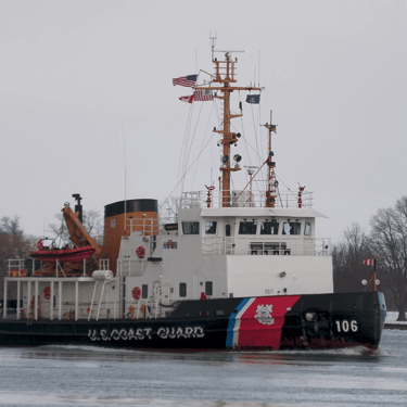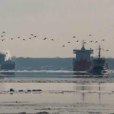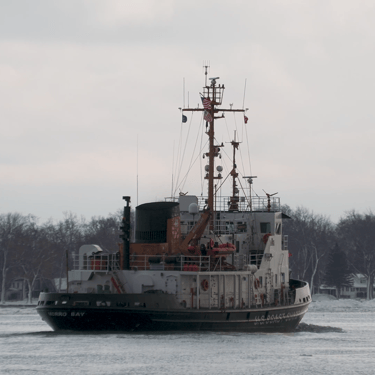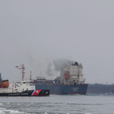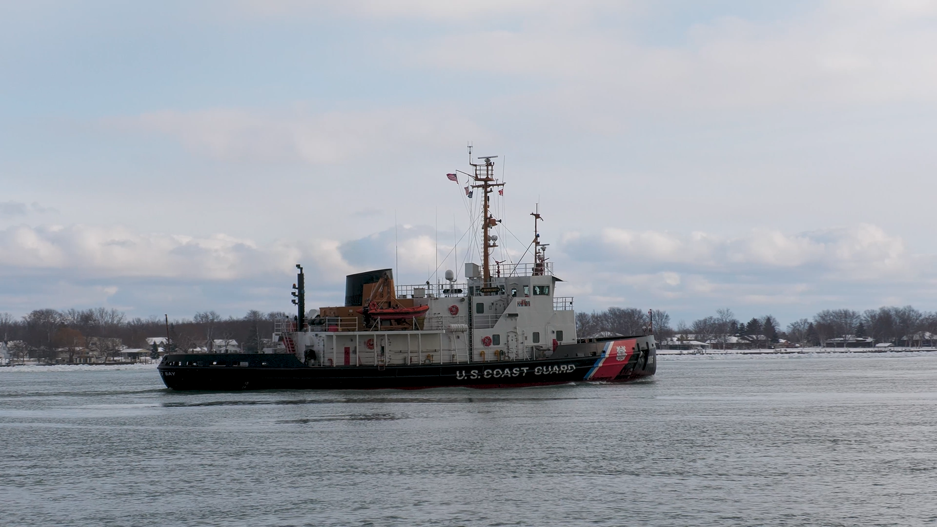 740’ Great Lakes freighter Algoma Bear exchanges a horn salute with US Coast Guard Cutter Morro Bay, after a winter ice escort, on the St. Clair River. February 1, 2025.