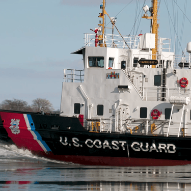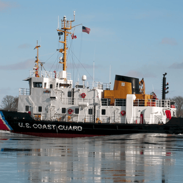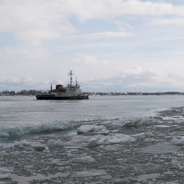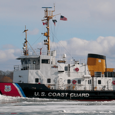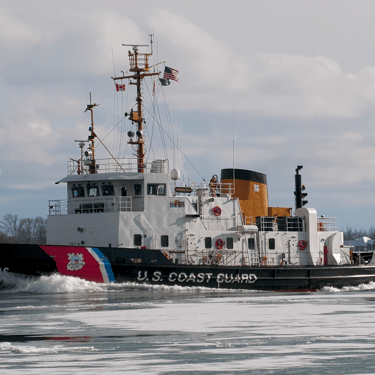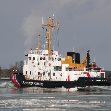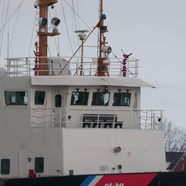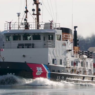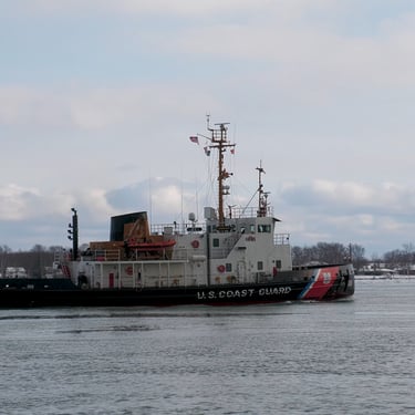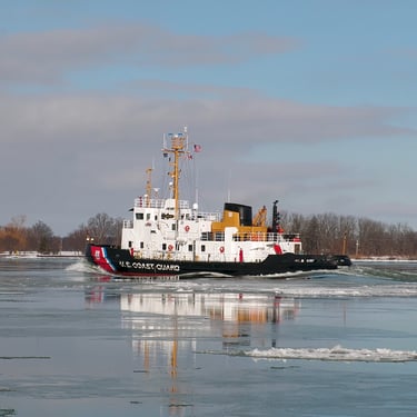 United States Coast Guard Ship USCGC Morro Bay on Great Lakes icebreaking operations, escorting the tanker Algoluna (Algoma Central Corporation) and the self-unloading bulk carrier Algoma Bear (Algoma Central Corporation) up the icy St. Clair River, in Marine City, Michigan. February 1, 2025.