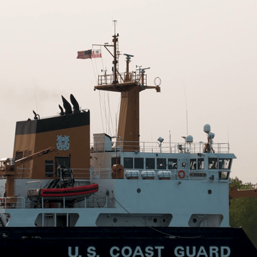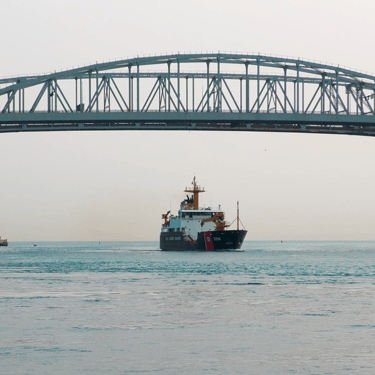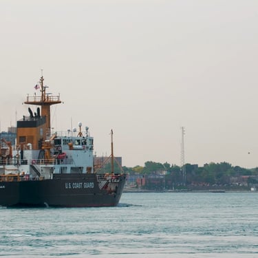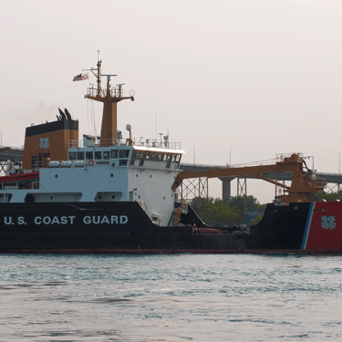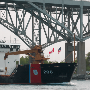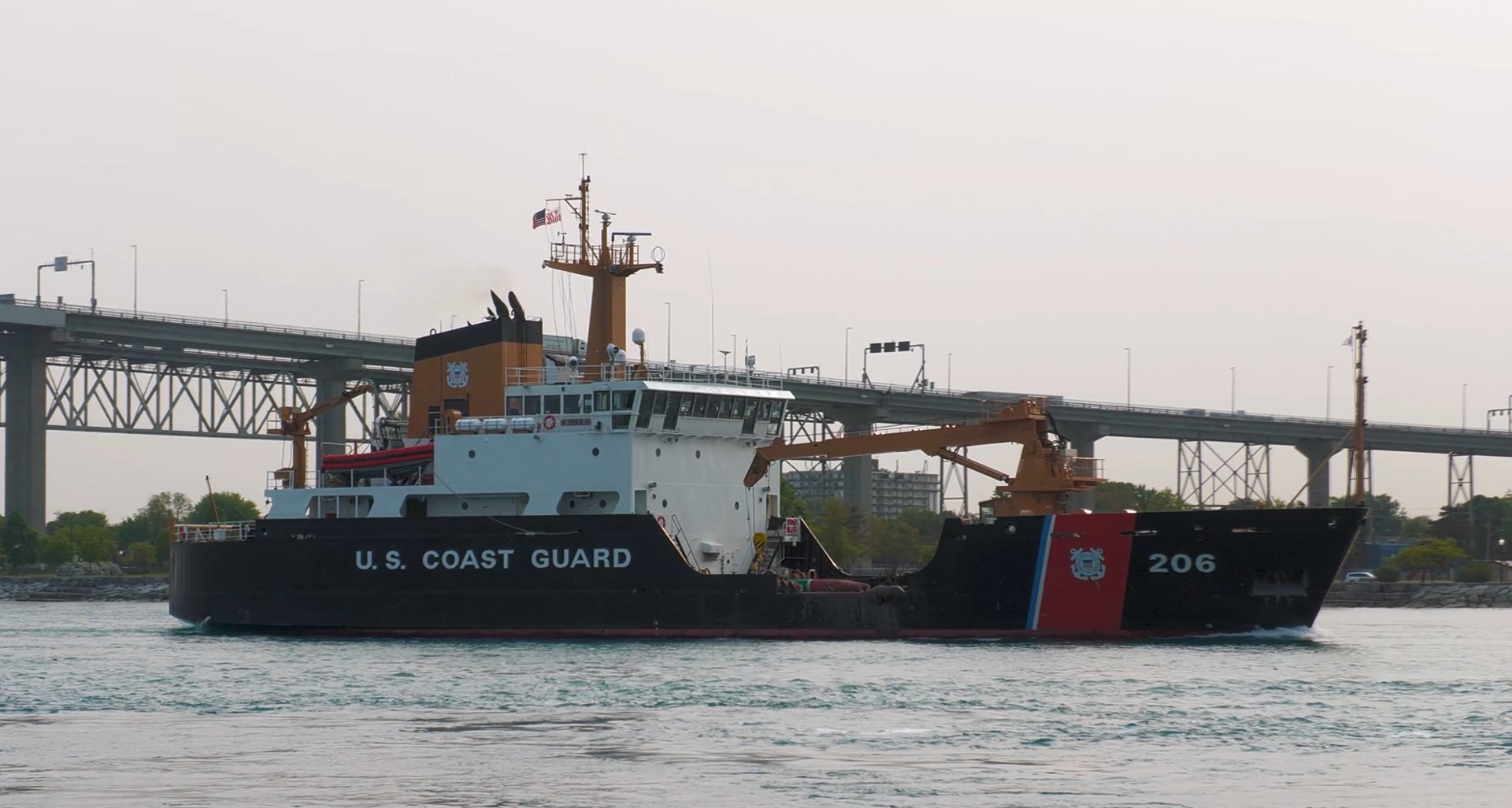 USCGC Spar, from Duluth, Minnesota, passes under the Blue Water Bridge on the St. Clair River and exchanges a horn salute with her sister ship, USCGC Sequoia, from Port Huron, Michigan. June 03, 2025.