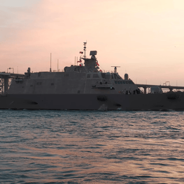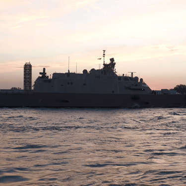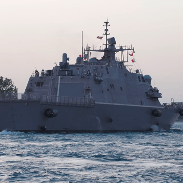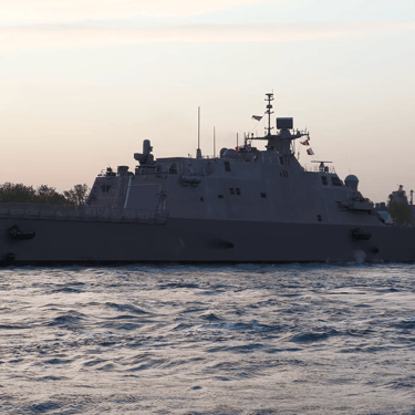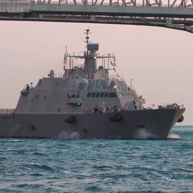 US Navy ship, USS Nantucket (LCS-27), a Freedom class littoral combat ship, on the St. Clair River in St. Clair, Michigan. October 06, 2024.
