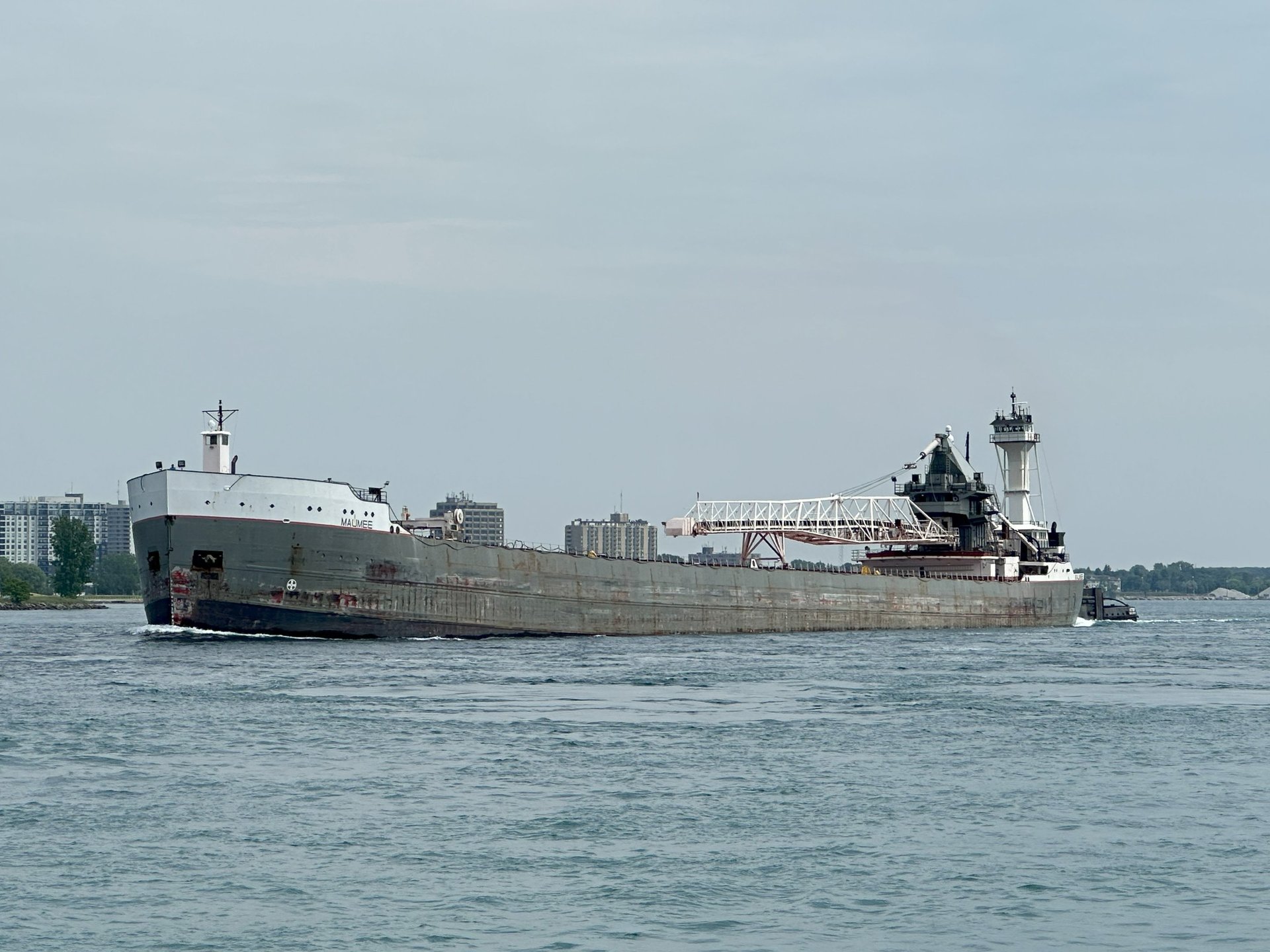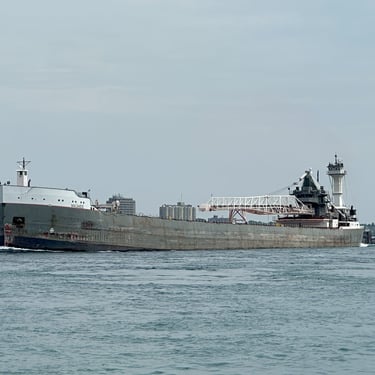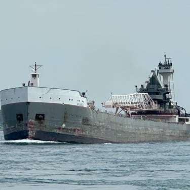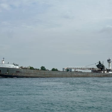 Great Lakes freighters and Grand River Navigation fleet mates, 680' John J. Boland and 815' tug-barge Victory-Maumee meet on the St. Clair River and exchange a hearty salute and a hoot, in Marine City, Michigan. Near the end, the 1,004' freighter Mesabi Miner is seen unloading coal at the DTE plant. May 11, 2025.