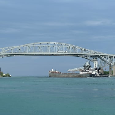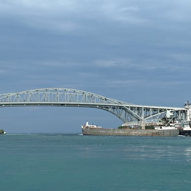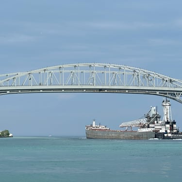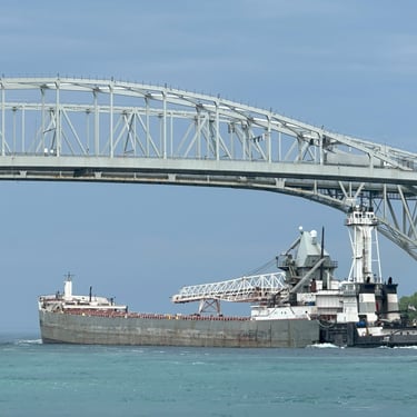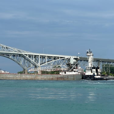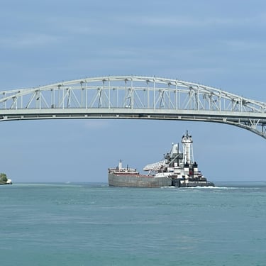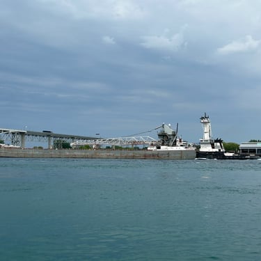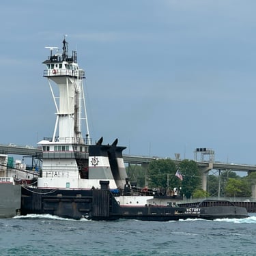 Articulated tug-barge Victory-Maumee (Grand River Navigation) returns a Great Lakes captain's salute from the Huron Lightship Museum, on the St. Clair River, then passes under the Blue Water Bridge to start her voyage across Lake Huron. Canadian freighter Algoma Compass can be seen in the background, arriving in Sarnia, Ontario, Canada. June 20, 2025.