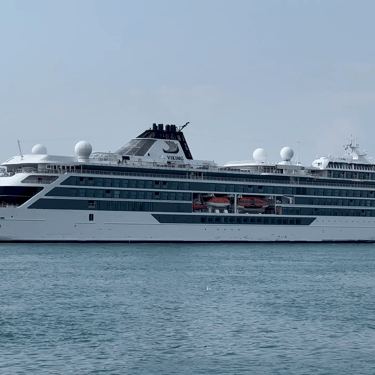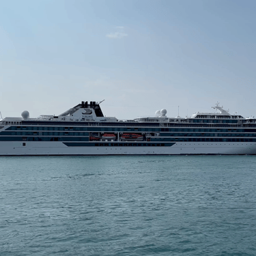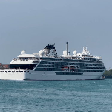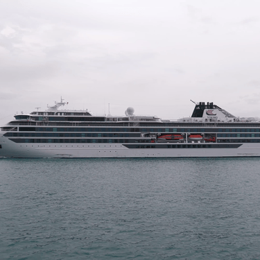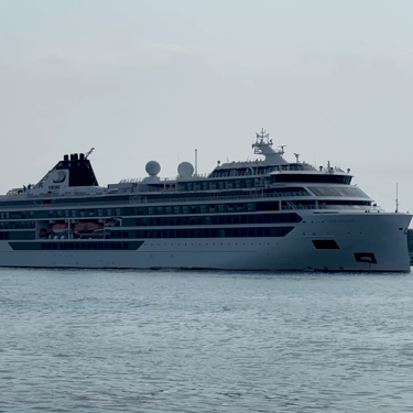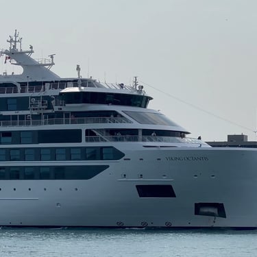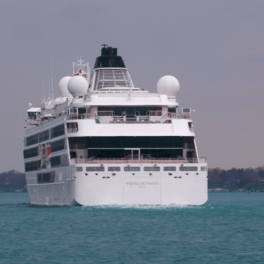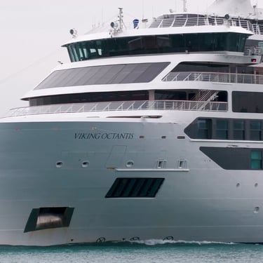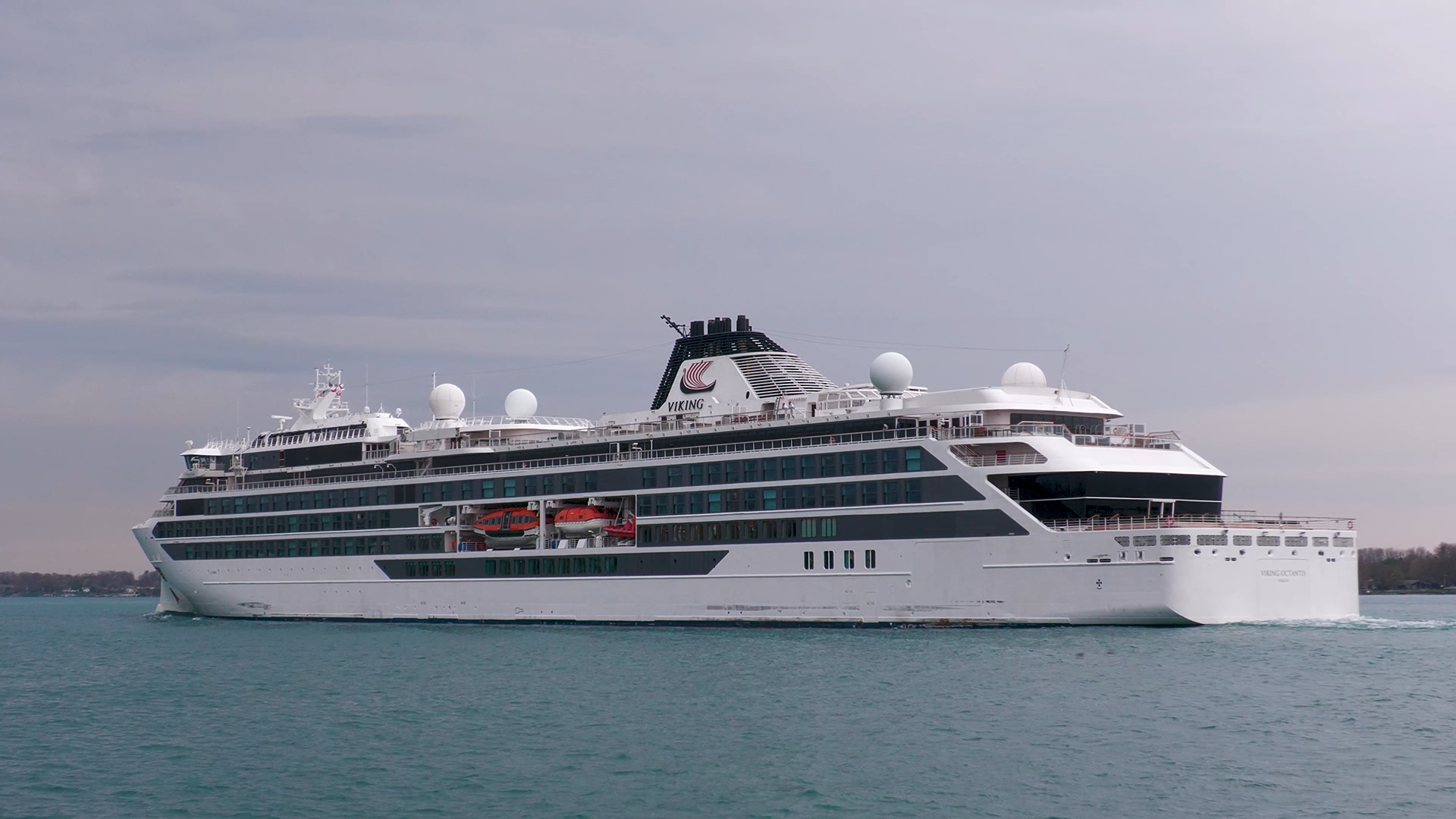 665' Polar Class 6 cruise ship, Viking Octantis (Viking Cruises) sailing down the Detroit River, on a Great Lakes cruise voyage from Mackinac Island, Michigan to Detroit, Michigan. Recorded from Belle Isle, August 25, 2024.