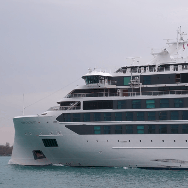 Great Lakes cruise Ship blasts out a nice salute! 665' Polar Class 6 cruise ship, Viking Octantis (Viking Cruises) heading upbound on the St. Clair River, to Alpena, Michigan, from Detroit, Michigan. Recorded in St. Clair, Michigan, April 25, 2025.
