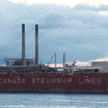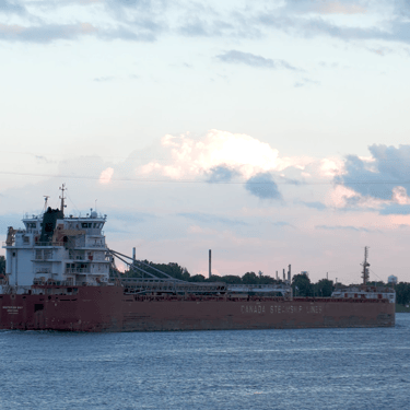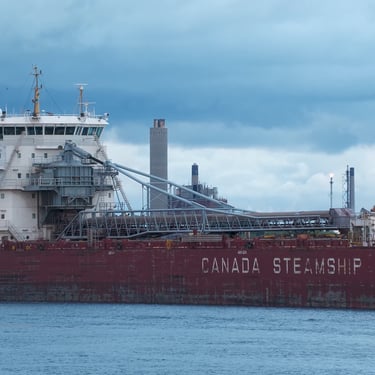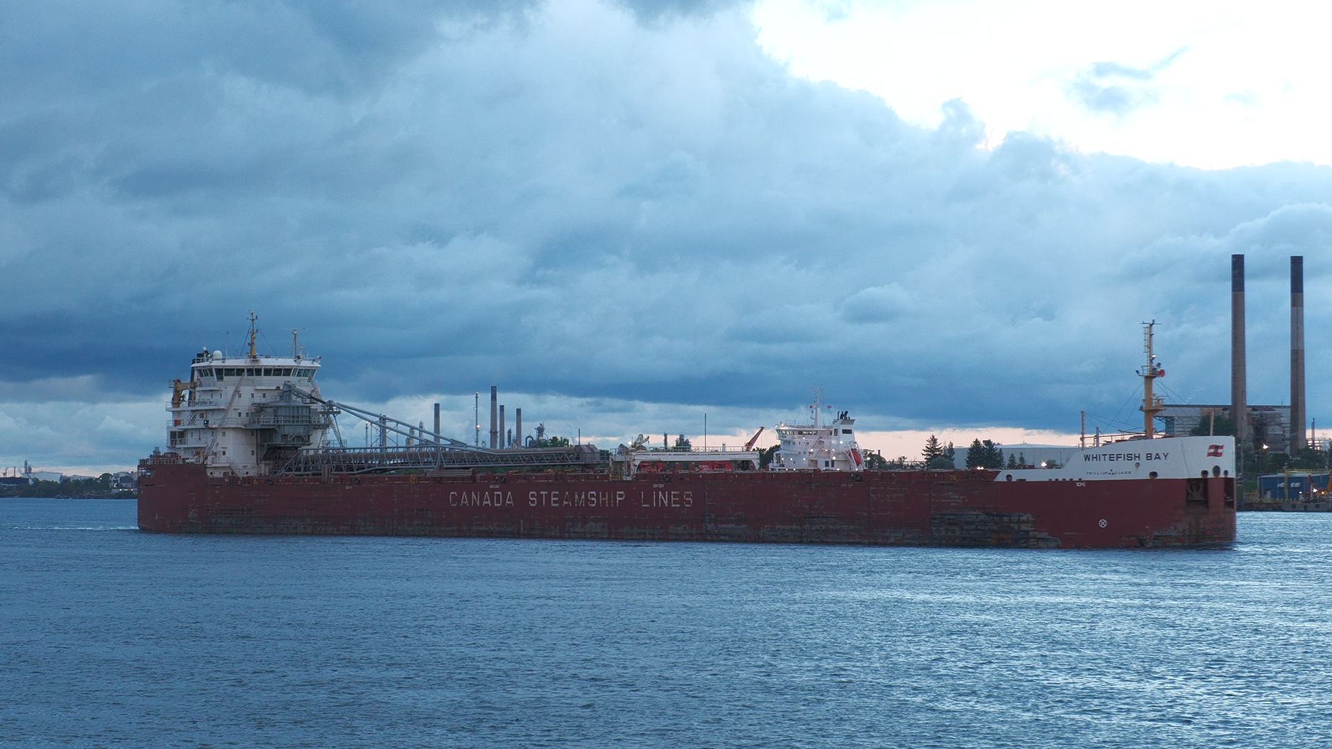 Great Lakes freighter Whitefish Bay (Canada Steamship Lines) downbound on the St. Clair River, exchanges a salute with the tour boat Huron Lady II, as she passes Sten Hidra (Moored in Sarnia, Ontario) and Northern Venture (upbound). August 28, 2025.